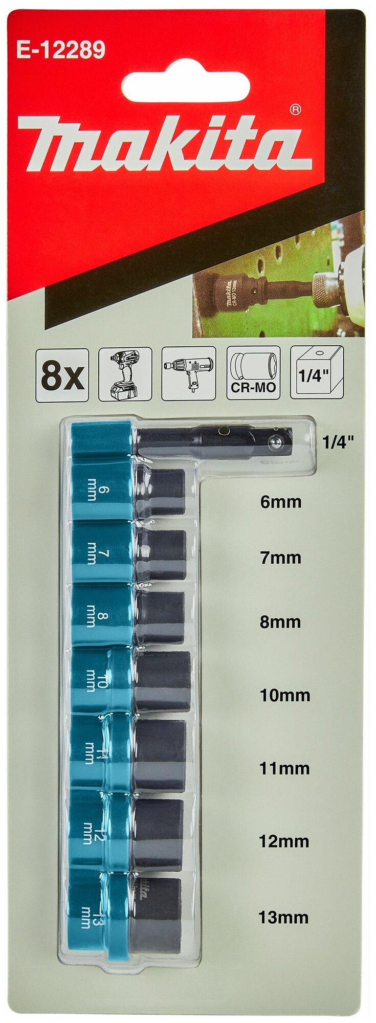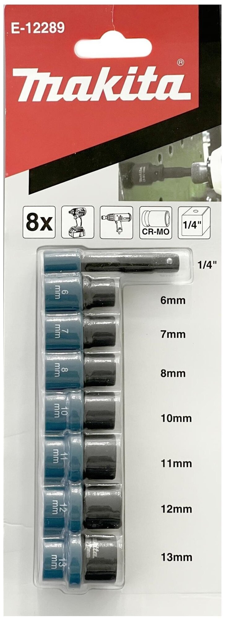 Набор ударных торцовых головок 1/4 8 шт. (6, 7, 8, 10, 11, 12, 13 мм, адаптер) Makita E-12289: сравнение цен, характеристики, фото, актуальное наличие и цены.