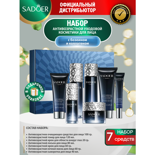 Набор уходовой косметики для лица Sadoer с бозеином и коллагеном. Антивозрастное очищающее средство для лица с бозеином и коллагеном 100 гр, обеспечивает деликатное очищение. Антивозрастной тонер для лица с бозеином и коллагеном 120 мл, активно питают, насыщая кожу витаминами и микроэлементами, способствуя улучшению ее текстуры и цвета. Антивозрастной крем для области вокруг глаз с бозеином и коллагеном 20 гр, обеспечивает глубокое увлажнение, питание и восстановление клеток, помогая уменьшить видимые морщины, темные круги и отеки. Антивозрастной лосьон для лица с бозеином и коллагеном 80 мл, стимулирует процесс регенерации клеток, способствуя обновлению и восстановлению кожи. Антивозрастной крем для лица с бозеином и коллагеном 60 гр, помогает восполнить дефицит витаминов и питательных веществ. Антивозрастная ночная маска для лица с бозеином и коллагеном 60 гр, восстанавливает эластичность и упругость кожи. Антивозрастная сыворотка для лица с бозеином и коллагеном 40 мл, активно восстанавливает, омолаживает и разлаживает кожу.