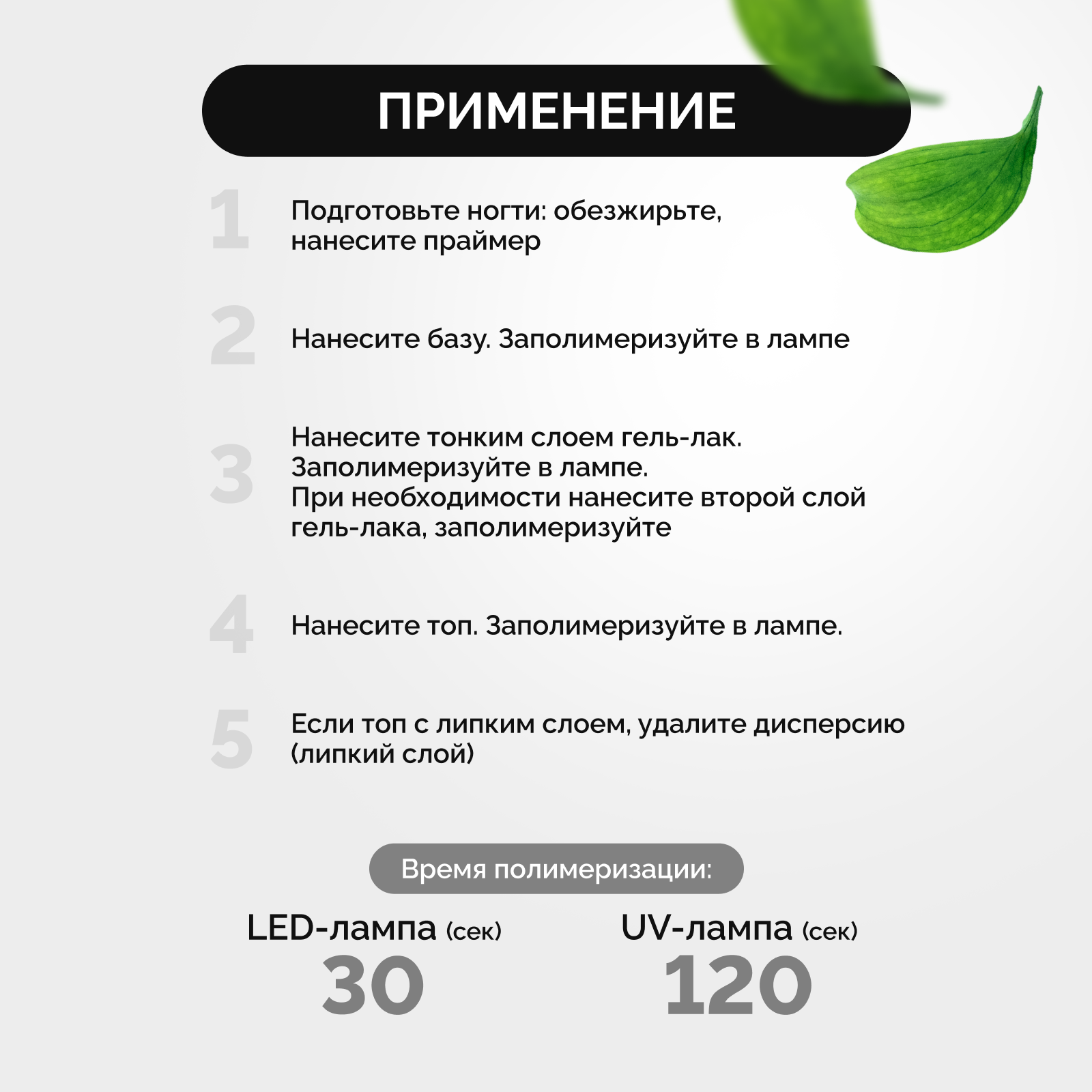 На подготовленную, обезжиренную ногтевую пластину нанесите базовое покрытие. Рекомендованное время полимеризации в UV-лампе – 2 мин., в LED-лампе – 60 сек.