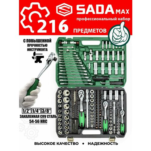 SADA Max 219 комбинированные ключи, шестигранники, торцевые, глубокие головки, реверсивные трещоточные ключи (малый, средний, большой), отвертки, удлинители, биты H, PH, PZ, T, TT, SL, S, TriWing, TORQ, FD, PZ, PH, TX, HEX, M, TT