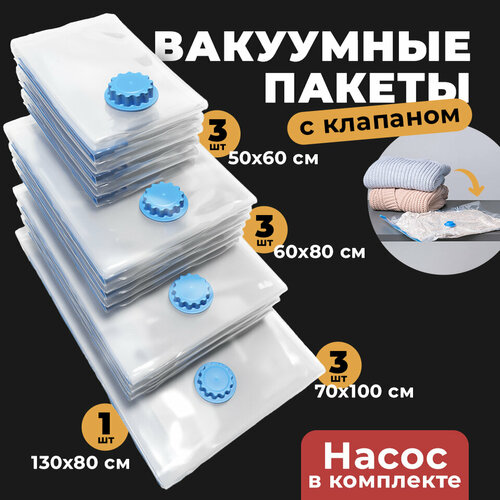 Прозрачные пакетики для вакуумирования и хранения одежды, обуви, игрушек. Состав набора: 10 вакуумных зип пакетов с клапаном (50x60 - 3шт 60 x 80 - 3 шт 70 x 100 - 3 шт 130х80 - 1 шт). Набор компрессионных пакетов с застежкой экономит 75% места в шкафу и незаменим для хранения и транспортировки вещей при путешествии и переезде. Вакуумный упаковщик герметичен и водонепроницаем, защищает вещи от воздействия пыли, влаги, плесени, бактерий и насекомых. Вакуумные пакеты для одежды имеют прозрачный материал, он позволит легко ориентироваться в содержимом и быстро найти нужную вещь. Большой чехол для одежды изготовлен из высококачественных материалов. Прочность и эластичность материала, конструкция замка двойной молнии и клапана позволяют использовать вакуум пакеты многократно. Многоразовые мешки для одежды с замком подходят для хранения вещей из всех типов тканей. Вакууматор от Birdhouse - надежное и практичное решение для Вашего дома.