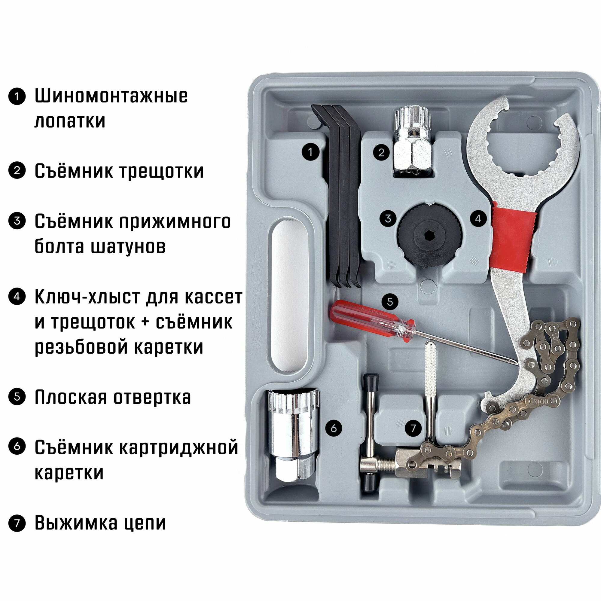 для бортировки колёс, для втулок, для затяжки спиц, для затяжки трещоток, для локринга, для педалей, для ремонта камер, для сборки и правки колёс, для снятия кассеты, для снятия покрышек, для снятия трещотки, для снятия/установки картриджей каретки, для тормозных колодок, для шатунов
