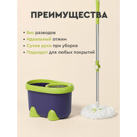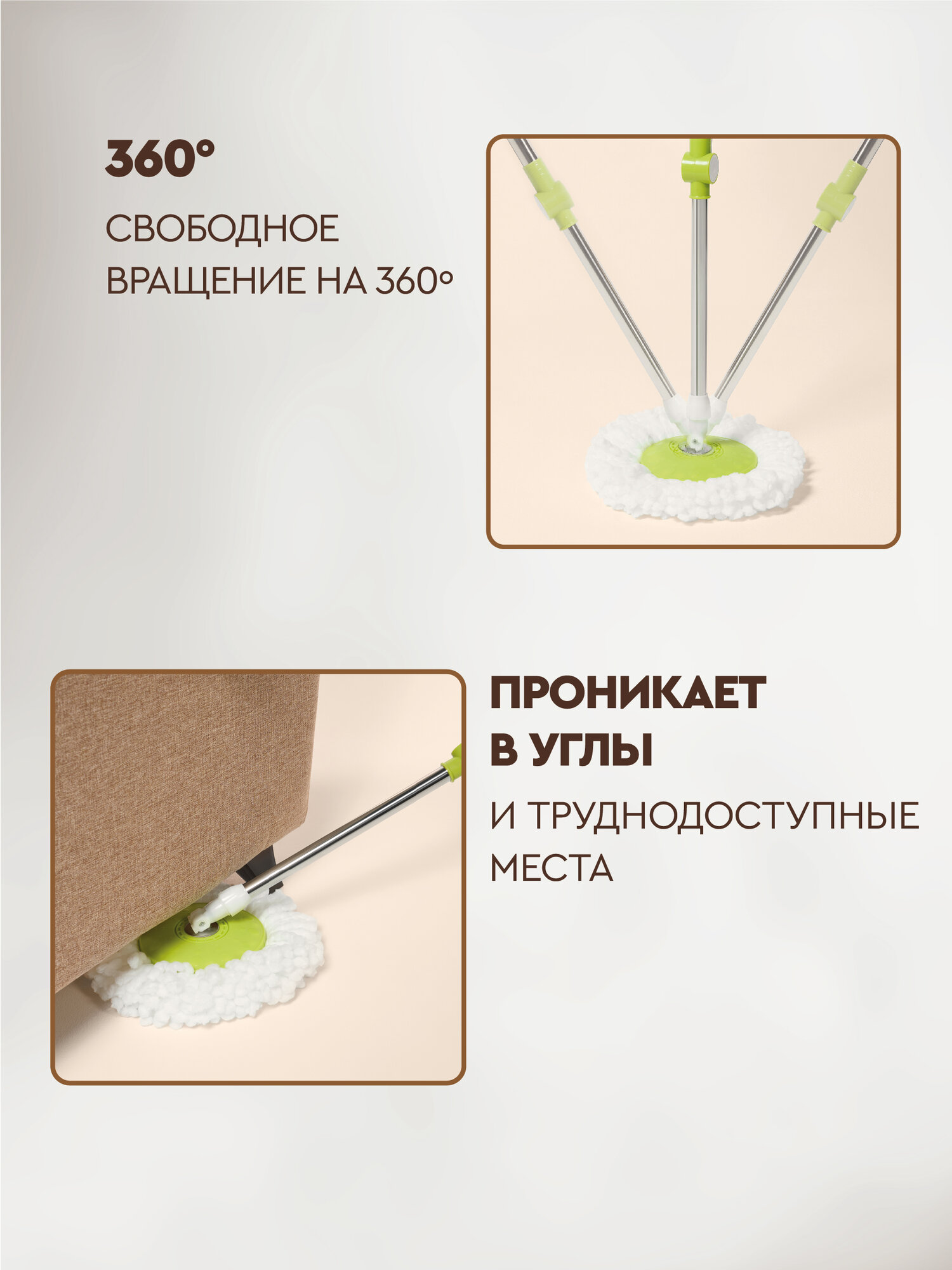 металлический отжим, поворот швабры на 360 градусов, удобные колесики на ведре, отверстие для слива воды