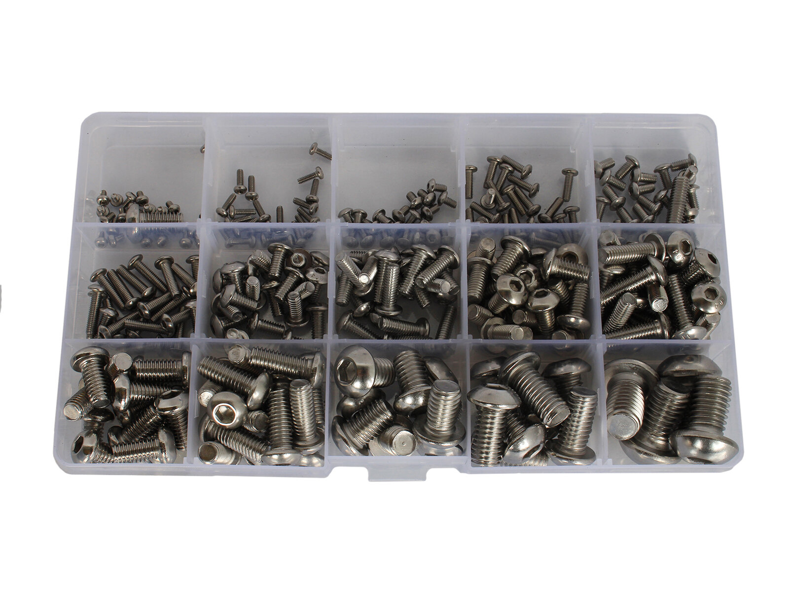 Набор винтов с сферической головкой и внутренним шестигранником. Назначение: предназначен для создания соединений при работе с металлом, деревом, пластиком и тд. Имеет плоскую скруглённую головку и полную резьбу. В набор входят: М2 х 3 - 20 шт М2 х 6 - 20 шт М2.5 х 4 - 20 шт М2.5 х 8 - 20 шт М3 х 6 - 20 шт М3 х 12 - 20 шт М4 х 8 - 20 шт М4 х 12 - 20 шт М5 х 10 - 20 шт М5 х 16 - 20 шт М6 х 12 - 15 шт М6 х 16 - 15 шт М8 х 12 - 8 шт М8 х 16 - 8 шт М10 х 16 - 4 шт Материал: нержавеющая сталь