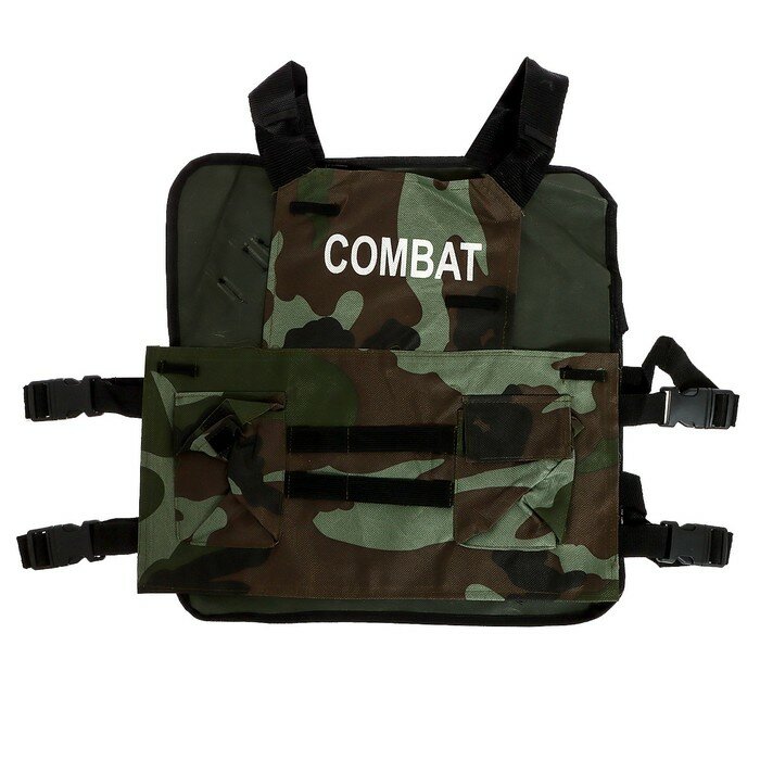 - Камуфлированный бронежилет из текстиля с множеством карманов.