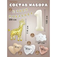 Яркие, красивые, плотные фольгированные шары с гелием без постороннего запаха, премиального качества. Порадуют вас на празднике. В составе набора: фольгированная единица - 1 шт; фольгированная фигура "Жираф" - 1 шт; фольгированная фигура "Облачко" - 1 шт; фольгированные сердца - 5 шт; гирлянда-растяжка с надписью "С днем рождения" - 1 шт. Эти шары станут прекрасным украшением для дня рождения, вечеринки или романтического вечера. Благодаря своей яркой окраске и блестящей поверхности, они добавят праздничного настроения любому событию.