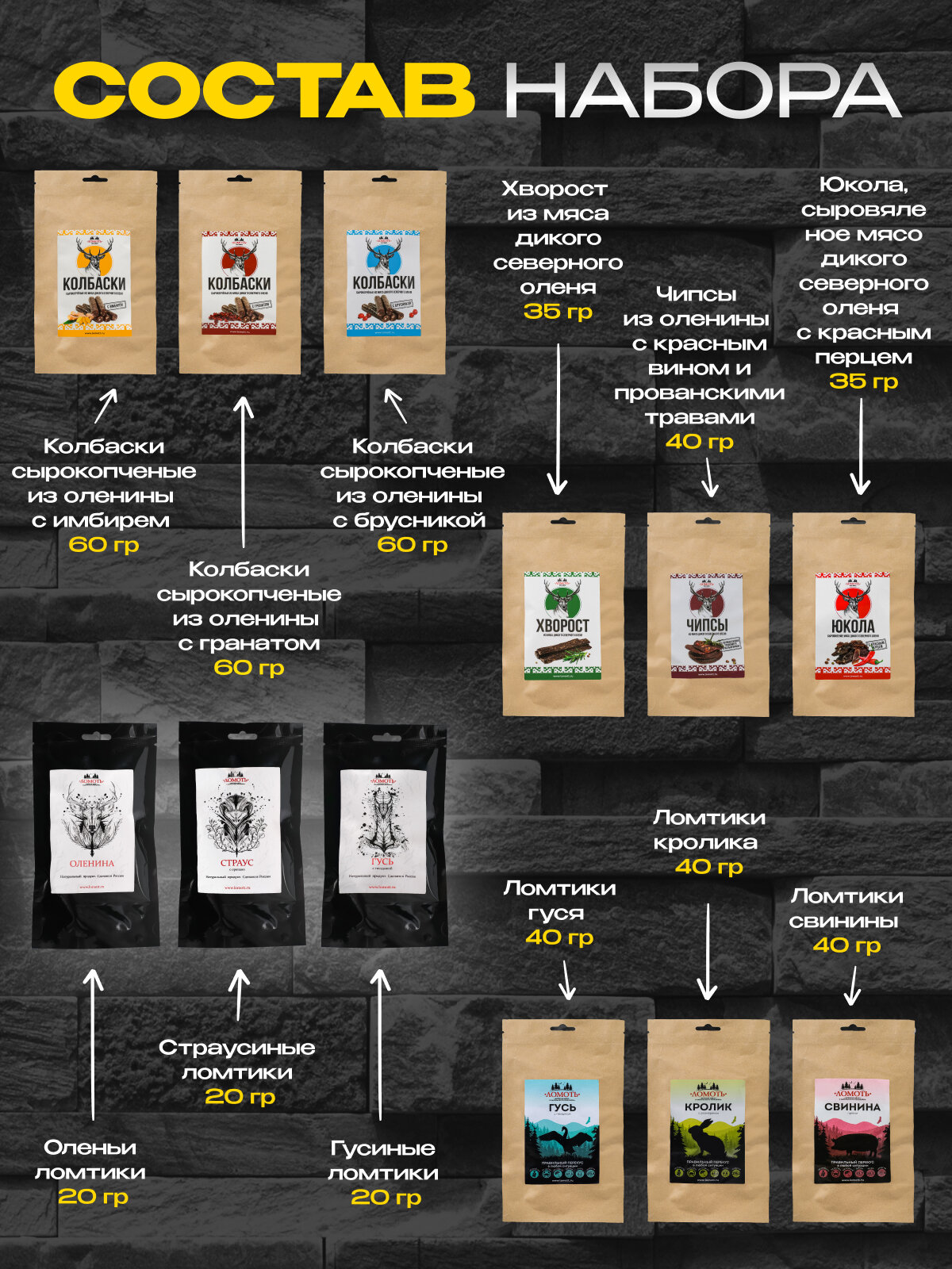 Курица классическая 40гр. Говядина оригинальная 40 гр. Конина с чесноком и кориандром 40 гр. Индейка с куркумой 40 гр. Баранина с кориандром 40 гр. Лось с можжевельником 40 гр. Оленина 40гр. Страус с орегано 40 гр. Утка с черносливом 40 гр. Конина с чесноком и кориандром 20гр. Говядина оригинальная 20 гр. Индейка с куркумой 20 гр. Колбаски сырокопченые из оленины с имбирем, 60 гр Колбаски сырокопченые из оленины с гранатом, 60 гр Колбаски сырокопченые из оленины с брусникой , 60 г Хворост из мяса дикого северного оленя, 35 гр. Чипсы из оленины с красным вином и прованскими травами, 40 гр Юкола, сыровяленое мясо дикого северного оленя с красным перцем, 35 гр Гусиные ломтики, 20 гр. Страусиные ломтики, 20 гр. Оленьи ломтики, 20 гр. Ломтики Гуся, 40 гр Ломтики кролика, 40 гр Ломтики Свинины 40 г. Подарочный деревянный ящик MISTER BOX