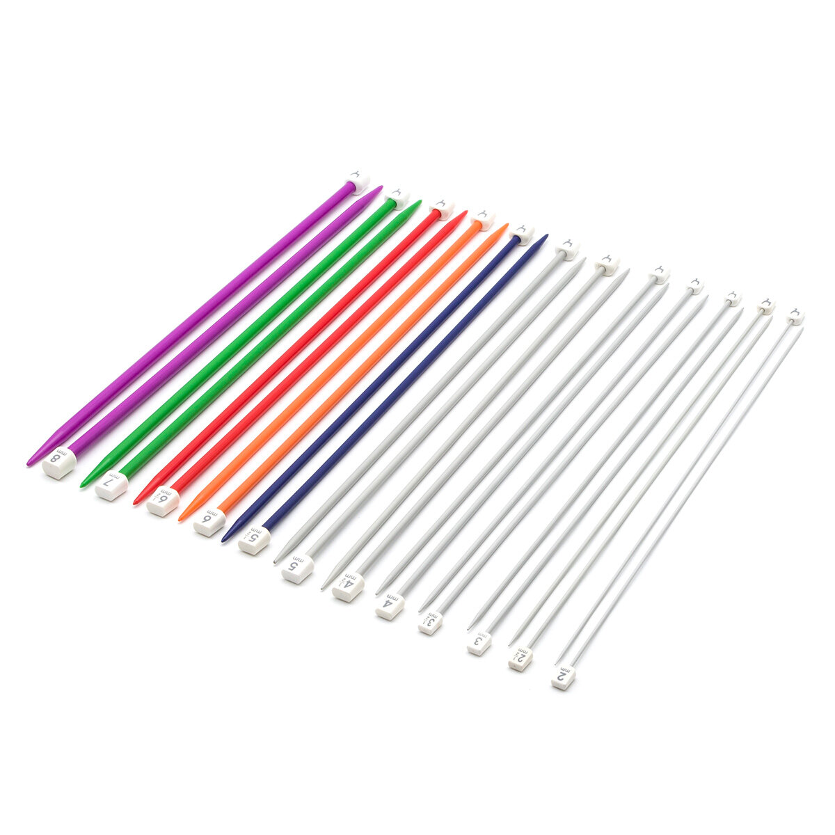 В наборе 12 пар прямых спиц длиной 35 см, из алюминия и цветного пластика. Пластиковые спицы не травмируют пальцы, их можно доверить детям, а яркие цвета поднимут настроение. Благодаря оригинальной технологии обработки алюминиевые спицы не гнутся и очень гладкие, при этом светлая шерстяная пряжа от соприкосновения с алюминием не темнеет.
