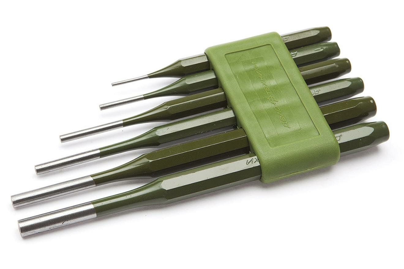 Выколотки применяются для выбивания соединительных элементов таких как штифты, шплинты, шпонки и т. п. Повышенная твёрдость рабочих поверхностей достигается за счёт дополнительной закалки ТВЧ. Состав набора: — выколотки: 2×115, 3×125, 4×150, 5×165, 6×180, 8×180 мм — пластиковый холдер Материал: сталь 60CrV Твёрдость: 52 — 56 HRC Покрытие: спецэмаль