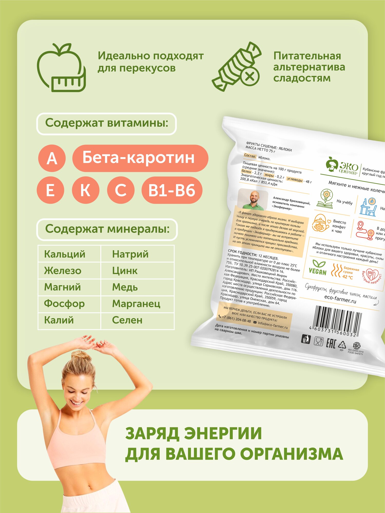 Сделано на Кубани! Большой набор сушеных яблочек из 10 упаковок. Как-будто только с ветки! Мягкие яблочные колечки, очищенные от кожуры и сердцевины, заботливо высушенные по технологии низкотемпературной сушки, чтобы сохранить максимум природной пользы. Удобный и натуральный перекус на работу, прогулку, в дорогу. Где бы вы ни находились - ароматное кубанское яблочко всегда будет под рукой! Так же наши вкуснейшие колечки придутся по вкусу сладкоежкам, которые следят за своим здоровьем, ведь мы не вымачиваем сухофрукты в сахаре, не обрабатываем диоксидом серы! Поэтому, держа в руках упаковку любого продукта от "Экофермер", вы можете быть уверены в безупречном вкусе и отсутствии вредных компонентов.