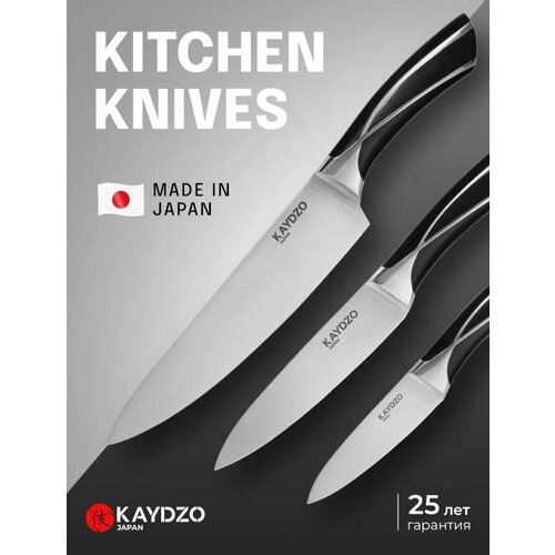 KAYDZO - известный бренд японских кухонных ножей. KAYDZO - это качественные и стильные ножи и аксессуары , которая будет радовать вас безупречной функциональностью, удобством работы и эстетичным дизайном каждый день! Ножи от бренда KAYDZO поставляются в наборе из трех штук, в подарочной упаковке в виде стильной коробочки (коробки для хранения). Комплект включает овощной, универсальный и шеф - нож, удобный также в виде ресторанного. Качественные изделия изготовлены из прочной японской стали AUS-8, украшены изящной гравировкой и логотипом бренда. Изысканную модель отличает серо - серебристый цвет рабочей части, антибактериальное покрытие и двойная заточка для остроты металлических лезвий. Эргономичная рукоятка - ручка матового черного цвета удобно лежит в руке. Маленький овощной нож предназначен для работы с фруктами и овощами. Универсальный поварской будет удобен для повседневных задач: от чистки кожуры до нарезки сыра или хлеба для подачи. Большой шеф - нож традиционно работает в качестве разделочного приспособления с мясом и рыбой, с дичью и курицей. Красивые ножи, созданные по самым современным технологиям, подойдут для шинковки капусты и разрезания арбуза на куски, для подготовки продуктов к их последующему приготовлению и созданию вкусных кулинарно - кондитерских блюд. Профессиональный настольный инструмент выбирают для нарезки мяса на стейк или на шашлык, нарезания вареной картошки кубиками для мясного салата. Им удобно очищать сырой картофель от кожуры, шинковать капусту. Столовый прибор, воплощающий в себе японское качество и традиции дополнит комплект принадлежностей и аксессуаров для работы с продуктами. Многофункциональный инструмент выбирают для работы в домашних и дачных условиях женщины и девушки. Его берут с собой на пикник и в кемпинг, приобретают повара - мужчины. Это крутой и милый знак внимания для мастера кулинарии - мамы или бабушки. Произведено в Японии. Гарантия 25 лет. У нас есть акции и распродажи, вы можете купить наши товары в подарок со скидкой!