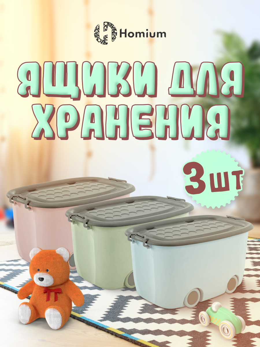 Купить Набор ящиков для хранения игрушек на колесах Homium большой, 3шт (голубой, розовый, коричневый, серая крышка) с доставкой по всей России.