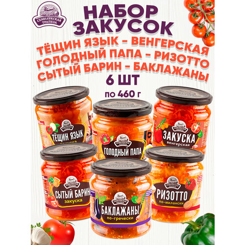 Закуски овощные «Семилукская трапеза» - являются вариантом полезного и вкусного продукта. Овощные закуски, приготовленные из тщательно отобранных овощей, выступают в качестве дополнения к гарнирам или же как самостоятельное блюдо. Выбирать только Вам! Закуска овощная Семилукская, готовое сытное, вкусное блюдо один из видов овощных консервов, которые пользуются популярностью повсеместно, особенно вне сезона свежего урожая. Закуски идеально подходят в любое время дня для завтрака, обеда и ужина. В качестве перекуса закуску овощную можно сочетать с хлебом, хлебцами, крекерами, тарталетками. Также закуски на основе натуральных овощей и круп можно подавать в качестве готового блюда. Продукт подходит как для любителей активных видов отдыха: рыболовов, охотников, путешественников, туристов, так и дачников и домохозяек, а также тех, кто соблюдает правильное питание. Закуски Семилукские изготавливается только из натуральных продуктов, без искусственных добавок и ГМО. Закуски овощные изготовлены по стандартам ТУ, упаковка в виде стеклянной банки с крышкой удобна для использования и хранения после первого вскрытия. Набор закусок «Семилукская трапеза» включают в себя такие вкусы как Тёщин язык - 1 банка, Голодный папа - 1 банка, Закуска Венгерская - 1 банка, Ризотто по-милански - 1 банка, Сытый барин - 1 банка, Баклажаны по-гречески - 1 банка!
