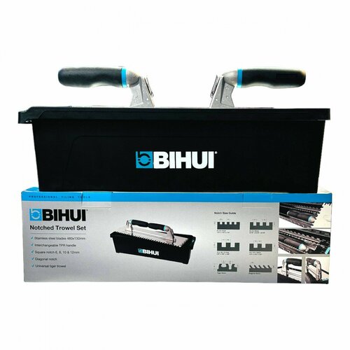 Шпатели набора Bihui BIG Combo изготовлены из нержавеющей стали и оснащены удобными сменными ручками для работы правой и левой рукой. Ручки гребёнок изготовлены из прочного и лёгкого алюминия. Гребёнка крепится к эргономичной рукоятке благодаря быстросъёмной системе BIHUI FLEX. Гребёнки изготовлены из высококачественной нержавеющей стали AISI 420. Гребёнки с открытой рукояткой облегчают контроль за движением инструмента во время нанесения клея. Размер гребёнки, типа и высоты зуба подбирается мастером исходя из параметров плитки, основания и клеящей смеси.
