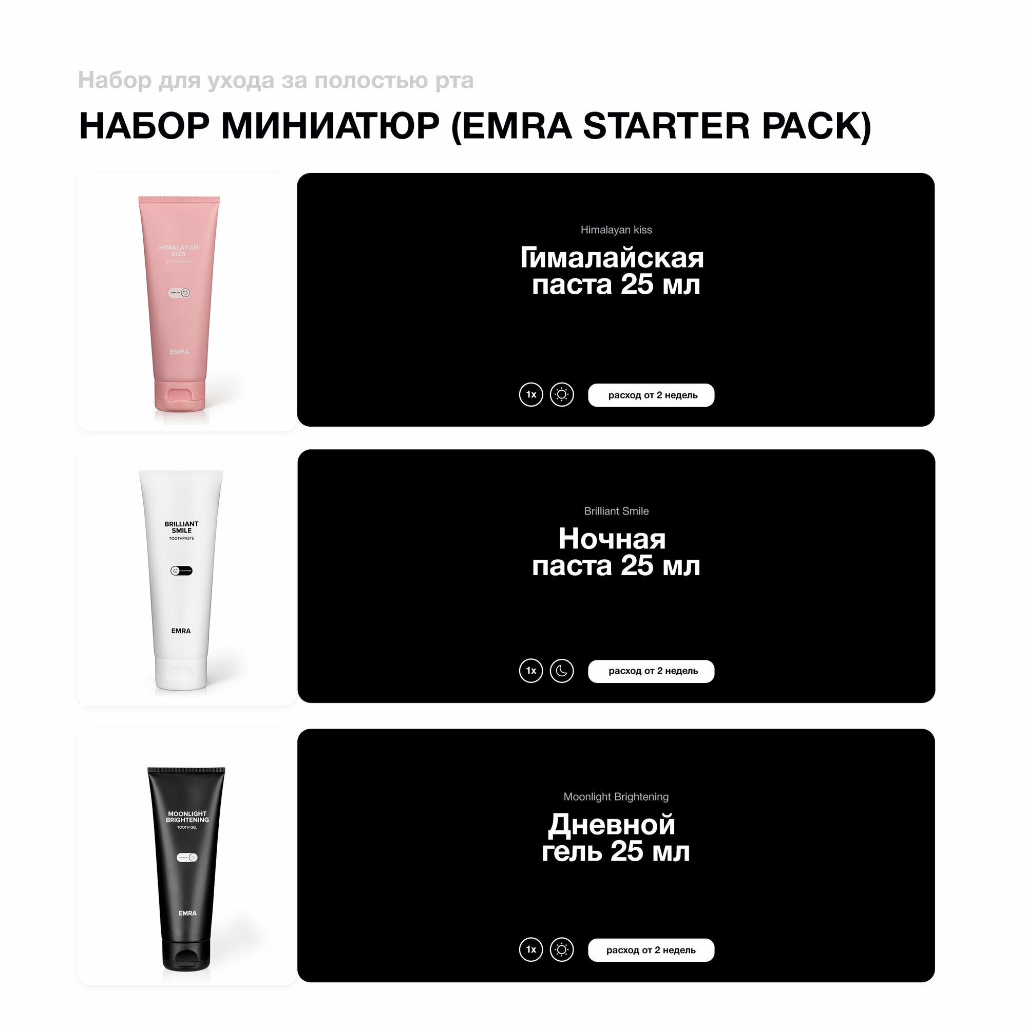 Набор зубных паст EMRA Starter Pack - это три мини-версии уникальных паст, созданные для комплексного ухода за полостью рта.