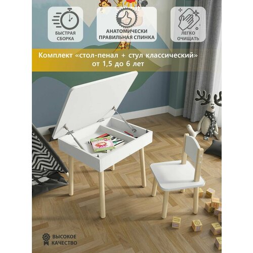 Стол пенал с открывной столешницей и стул "классический". Стол уже собран на 90% и поэтому сборка займет несколько минут. Подходит для детей от 1,5 лет и до 6лет. В подстолье столешницы есть ниша под канцелярию и разные раскраски, книжки. Столешница столика, сиденье и спинка стульчика сделаны из безопасного материала класса Е1, ножки из массива берёзы, гладкие, без покрытия. Углы столешницы закруглены и закрыты мягким мебельным кантом, подстолье обработано в кромке. Высота детского стола 52 см, размер столешницы 50х60 см. Высота детского стульчика 55 см (вместе со спинкой). Высота от пола до сиденья - 28 см. Удобно будет сидеть детям за данным комплектом ростом до 130 см. Детский стул и стол, комплект детской мебели, детская мебель, стол-пенал, детский стол пенал.