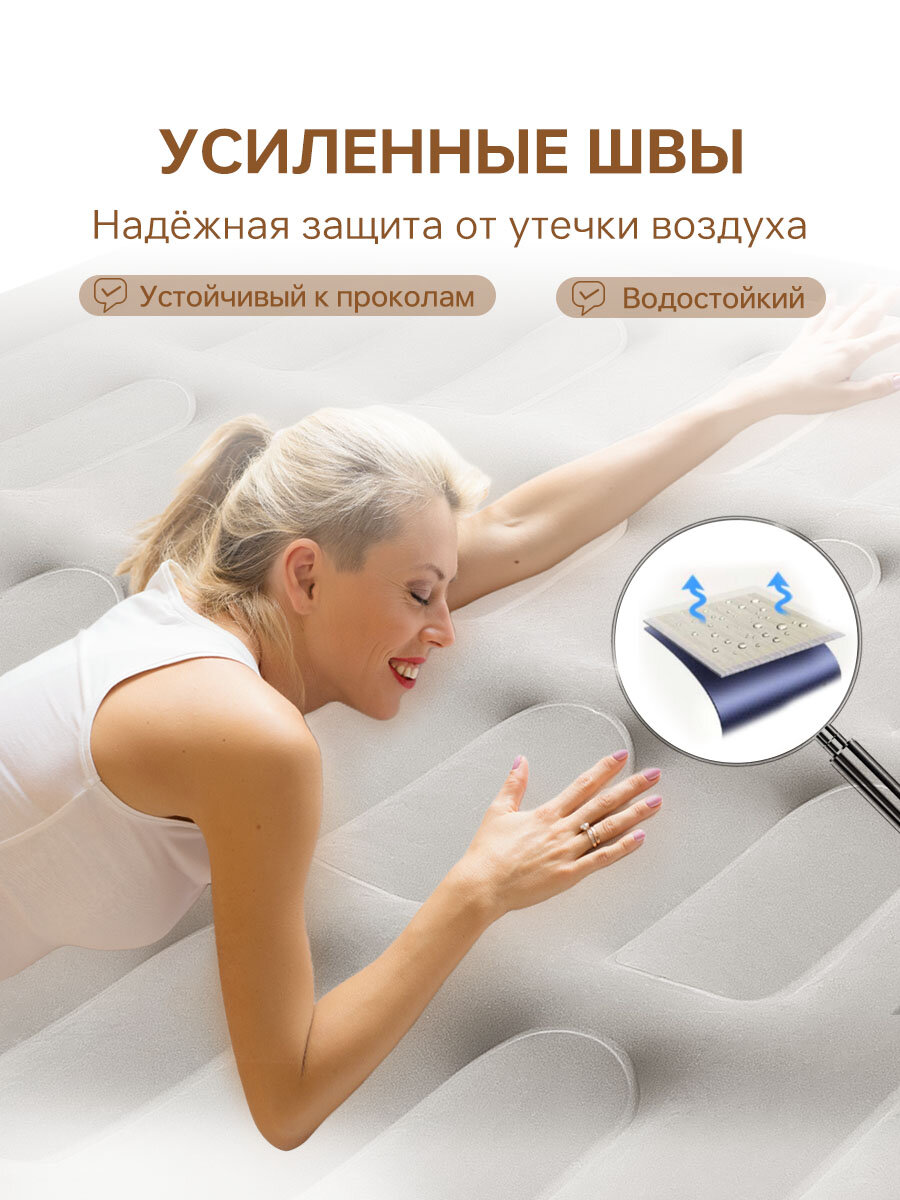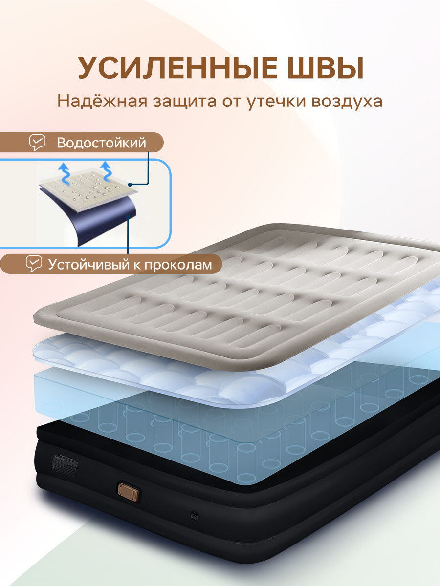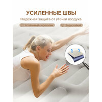 Матрас Надувной Двуспальный С Насосом Для Сна, Надувная Кровать Полутороспальный 200x150x40, Черное 1. Кровать изготовлена из материала ПВХ высокой плотности, который обладает хорошей эластичностью и прочностью, выдерживает большие ударные нагрузки и не так легко лопается. 2. Флокированное покрытие не даёт соскальзывать белью, и в тоже время легко чистится. 3. Встроенный электронасос позволяет быстро надувать и сдувать кровать и даёт возможность отрегулировать её упругость. При отсутствии электричества, кровать можно накачать механическим насосом. 4. Удобная поверхность для сна: Мягкий ворсистый верх обеспечивает повышенный комфорт и устойчивость. 5. Портативная конструкция: Компактное хранение и удобство переноски. Когда приближается праздник или день рождения, важно подобрать идеальный подарок, который одновременно будет полезным и оригинальным. Что может быть лучше, чем уникальный надувной матрас. Этот подарок станет незаменимым спутником в любой семейная и приятным сюрпризом для мужа или жены на 8 марта. Надувной матрас – это простое и функциональное изобретение, которое поможет вашим близким пользоваться своими устройствами с комфортом и безопасностью. Мужчины будут рады получить такой подарок на 23 февраля или день рождения. Стильный и элегантный дизайн этого матрас делает его отличным вариантом подарка для женщины на 8 марта. Характеристики: Размер: 150х200х40см. Размер упаковки: 19.5x35x42см. Вес упаковки: 7кг. Мощность насоса: 90 вт. Производительность насоса: 450л/мин. Время накачивания: 3мин. Максимальная нагрузка: 300кг. Комплектация Кровать, насос, инструкция, ремкомплект