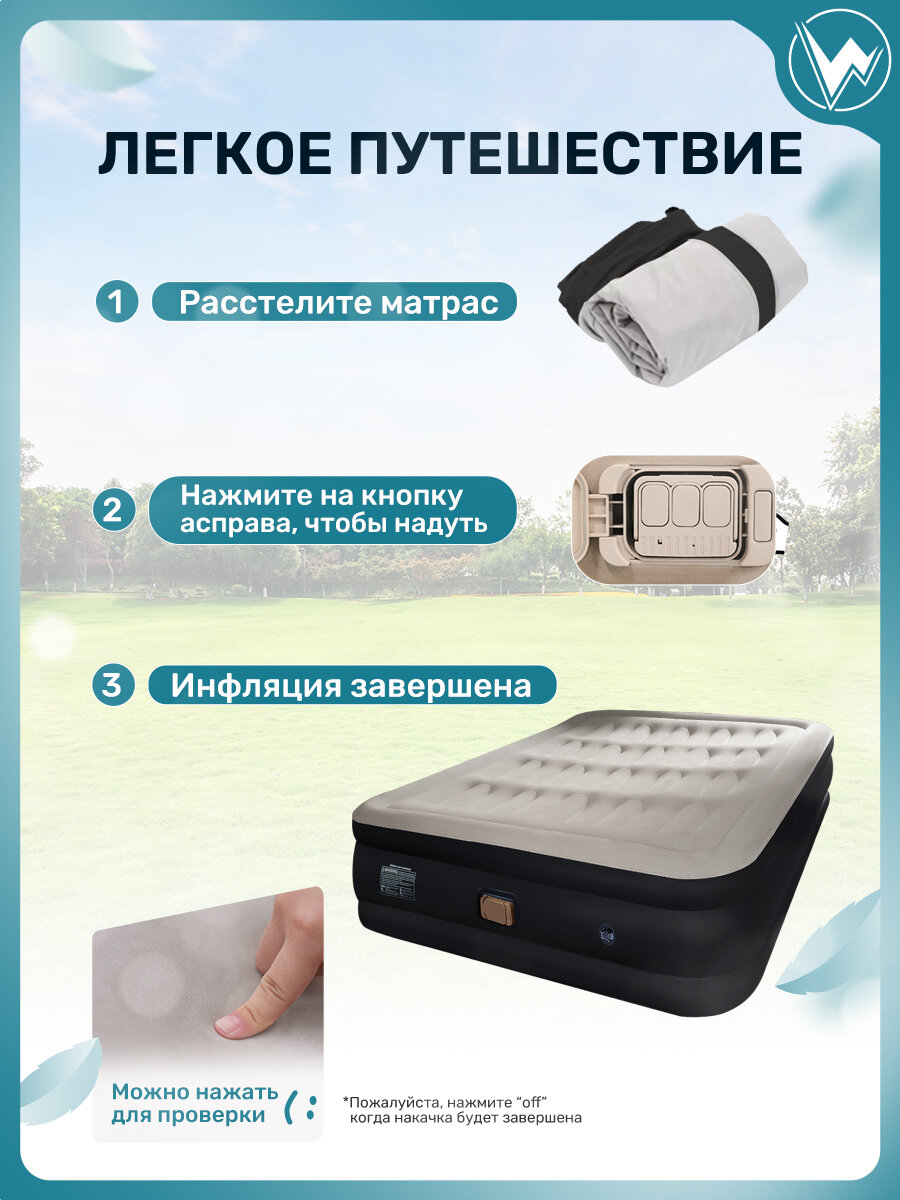 1. Кровать изготовлена из материала ПВХ высокой плотности, который обладает хорошей эластичностью и прочностью, выдерживает большие ударные нагрузки и не так легко лопается. 2. Флокированное покрытие не даёт соскальзывать белью, и в тоже время легко чистится. 3. Встроенный электронасос позволяет быстро надувать и сдувать кровать и даёт возможность отрегулировать её упругость. При отсутствии электричества, кровать можно накачать механическим насосом. 4. Удобная поверхность для сна: Мягкий ворсистый верх обеспечивает повышенный комфорт и устойчивость. 5. Портативная конструкция: Компактное хранение и удобство переноски.