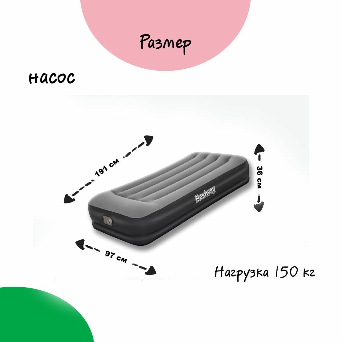 Bestway 67723 BW Надувная кровать 191х97х36см, с подголовником, встр. насос 220В, до 150кг Погрузитесь в мир комфорта с надувной кроватью Bestway! Устали от неудобных ночёвок на раскладушках или старых матрасах? Позвольте себе роскошь качественного сна даже вдали от дома с односпальной надувной кроватью Bestway! Это идеальный выбор для тех, кто ценит комфорт и удобство. Почему стоит выбрать надувную кровать Bestway? Совершенный комфорт: С эргономичным подголовником ваша шея и голова всегда будут в правильном положении, что обеспечит идеальный отдых после долгого дня. Встроенный насос: Прощайте, хлопоты с накачиванием! Встроенный насос быстро и легко надует вашу кровать всего за несколько минут. Готовьтесь к отдыху без лишних усилий! Насос подключается к стандартной электрической розетке. При отсутствии электричества, кровать можно накачать обычным механическим насосом или насосом от автомобильного прикуривателя. Для этого кровать снабжена специальным клапаном для подключения внешнего насоса. Качество и долговечность: Изготовленная из высококачественных, устойчивых к проколам материалов, эта надувная кровать прослужит вам долго и надежно. Вы можете смело использовать её как дома, так и на природе. Приятное флокированное покрытие поверхности кровати не даст соскальзывать постельному белью и покрывалам, легко чистится без применения специальных средств. Компактность и легкость: Легко складывается и помещается в специальный чехол, что делает её идеальным спутником для поездок, кемпингов и путешествий. Стильный дизайн: Современный и элегантный внешний вид прекрасно впишется в любой интерьер, добавляя нотку уюта вашему пространству. Спите спокойно, где бы вы ни были! Не упустите возможность насладиться качественным сном с надувной кроватью Bestway! Закажите прямо сейчас и почувствуйте разницу! На модель есть гарантия, по гарантийному случаю Вам нужно будет обратиться в официальный сервис Bestway. Специалисты сервиса решат все Ваши вопросы оперативно и профессионально! Внимание! Если Вы приобрели надувное изделие в зимнее время года, то НИ В коем случае не доставайте его сразу из коробки. Поставьте в теплое место, желательно возле батареи на 2 – 3 часа. Только после этого извлеките товар из коробки. Убедитесь, что материал стал мягким и накачайте на 80 %. Изделие примет форму, складки разгладятся, через час можно накачать полностью.