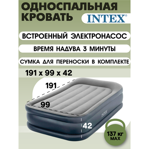 Надувная односпальная кровать модель 64132 с электрическим встроенным насосом размером 191х99х42 см (комфортная высота для сна) - недорогая модель мирового Бренда INTEX. Производится под контролем американского бренда в Китае, что позволяет быть лидером по качеству и сроку службы изделий. Надувные кровати мобильны в использовании и позволяют экономить место и быстро перевезти с объекта на объект или временно разместить гостей. Верхняя часть кровати по своим характеристикам напоминает велюр, она очень приятна на ощупь и не позволяет постельному белью соскальзывать во время отдыха. Комфортная высота для сна на кровати считается 42 см и выше. Встроенный насос позволит очень быстро за считанные минуты надуть и также есть обратный режим сдуть кровать! В комплекте с кроватью на всякий случай кладется ремонтный комплект. (Желтая маленькая наклейка, часто ее путают с рекламой бумагой, выкидывают, будьте внимательны и оставьте его)По качеству кровати, данные кровати служат до 10 лет, все зависит от бережности использования, на надувных кроватях нельзя прыгать, хранить на морозе и на сильном солнце в жару, внутри технология ниточная позволяющая комфортно спать и создавать анатомию для сна. Если Вам нужна кровать для командировок или для работы вахтовым методом, то лучше не экономить на качестве сна и приобрести более комфортную модель от 42 см и выше, на кровати 25 см будет не комфортно спать. Если Вы турист и хотите положить кровать матрас в палатку, то лучше использовать более низкие модели 22-25 см, так как высота палаток часто не позволяет уместить высокую кровать. Как быть уверенным, что матрас придет целым и не бракованным? (Все матрасы проходят на заводе роботами через отдел качества и проверяются перед упаковкой под нагрузкой, вероятность брака исключена, к тому же у Вас есть 100% гарантия на всю нашу продукцию).