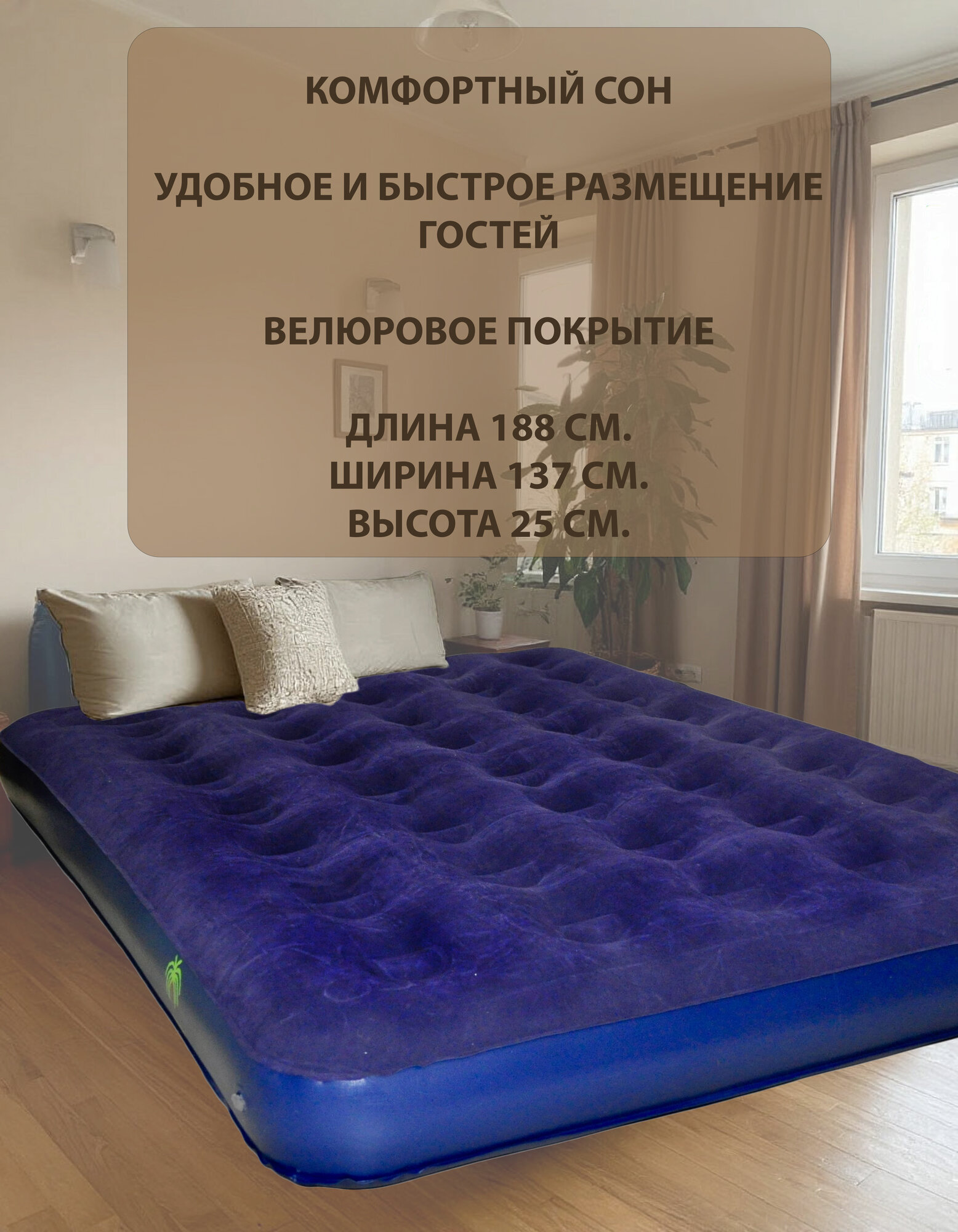 Матрас имеет размеры 188x137x25 см в надутом состоянии, что обеспечивает комфортное размещение двух человек. Велюровое покрытие матраса не только придает ему эстетический вид, но и обеспечивает мягкость и комфорт при использовании.