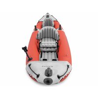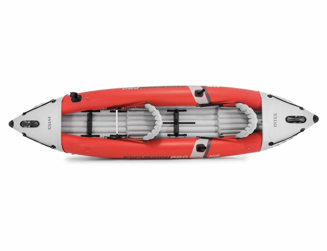 Надувная двухместная лодка-байдарка Excursion PRO, грузоподъемностью до 180 кг, изготовлена из высокотехнологичного трехслойного материала "Super Tough", состоящего из двух слоев особо прочного винила, между которыми проложена специальная сетка из полиэстера. Этот материал не боится воздействия агрессивной среды: бензина, машинного масла, соленой воды. Он устойчив к перепадам температур и воздействию солнечных лучей. Толщина "Super Tough" составляет 0,75 мм. Эта байдарка предназначена для озер и спокойных рек. Обтекаемая форма корпуса способствует легкому скольжению, яркая расцветка делает байдарку заметной на воде, обеспечивая безопасность, а надувной пол дает дополнительный комфорт и маневренность. Корпус лодки формируют две независимые воздушные камеры со специально разработанными клапанами для быстрого накачивания и спуска воздуха. Надувной пол имеет конструкцию Wave Beam: внутренние вертикальные виниловые перегородки идут параллельно бортам лодки, образуя продольные воздушные каналы, из-за которых поверхность пола выглядит волнистой. Надувной пол этой конструкции надежен, удобен и создает дополнительный комфорт пассажирам.