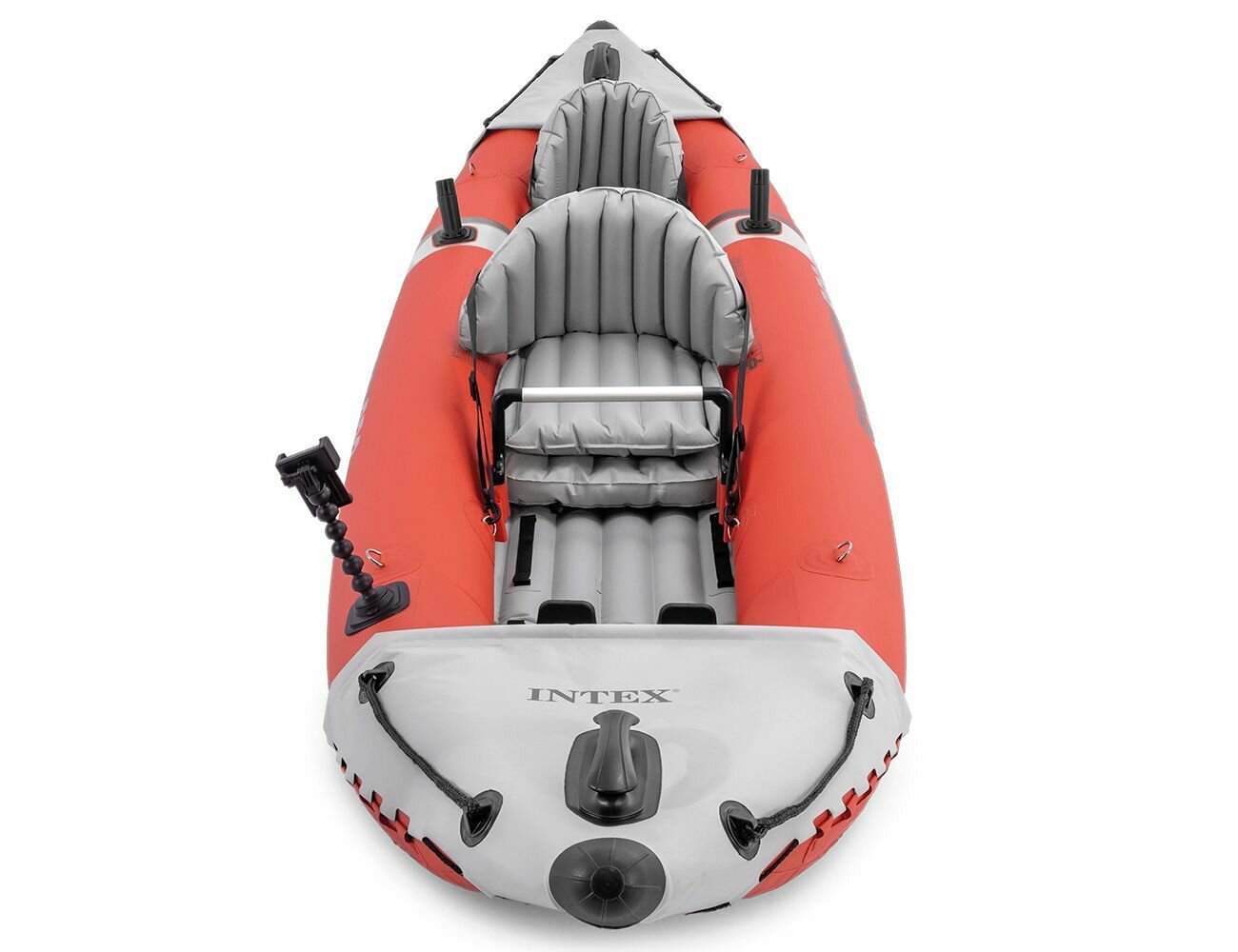 Также лодка оборудована двумя съемными скегами для оптимальной маневренности на глубокой воде и мелководье, двумя встроенными в пол регулируемыми подставками для ног и съемным кронштейном для дополнительных аксессуаров, таких как GPS-системы, эхолоты, поворотные держатели для удочек и т. д. На бортах расположено 2 встроенных крепления для удочек. В носовой и кормовой частях продуманы отделения для хранения вещей и снаряжения с нержавеющими стальными креплениями для обвязки. Удобство швартовки и буксирования обеспечивают внешние лееры и пластиковые ручки, находящиеся в носовой и кормовой частях байдарки. В комплект входят: ручной насос двойного действия High-Output Pump (арт. 68605), надувающий при движении поршня в обоих направлениях, легкие алюминиевые весла длиной 218 см, два удобных регулируемых по высоте надувных сиденья со спинками, сумка для хранения и транспортировки и ремнабор.