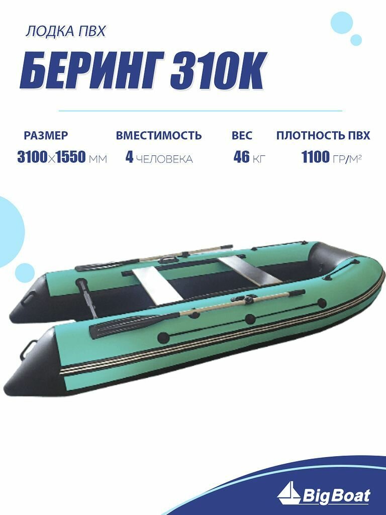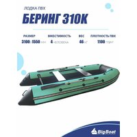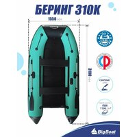 Лодка Bering 310K является транцевой килевой лодкой с габаритными размерами 3100х1550 мм и диаметром бортовых баллонов 460 мм. Данная лодка позволяет перевозить груз весом до 450 кг. Лодка состоит из 3 независимых надувных отсеков, позволяющих сохранить плавучесть лодки даже при аварийном проколе 2 из них