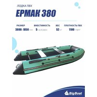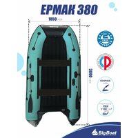 Лодка Ermak 380 является транцевой лодкой с габаритными размерами 3800х1850 мм и диаметром бортовых баллонов 500 мм. Грузоподъемность этой лодки до 570 кг. Конструкция лодки предусматривает наличие 3 независимых надувных отсеков, которые позволяют сохранить плавучесть лодки даже при аварийном проколе 2 из них