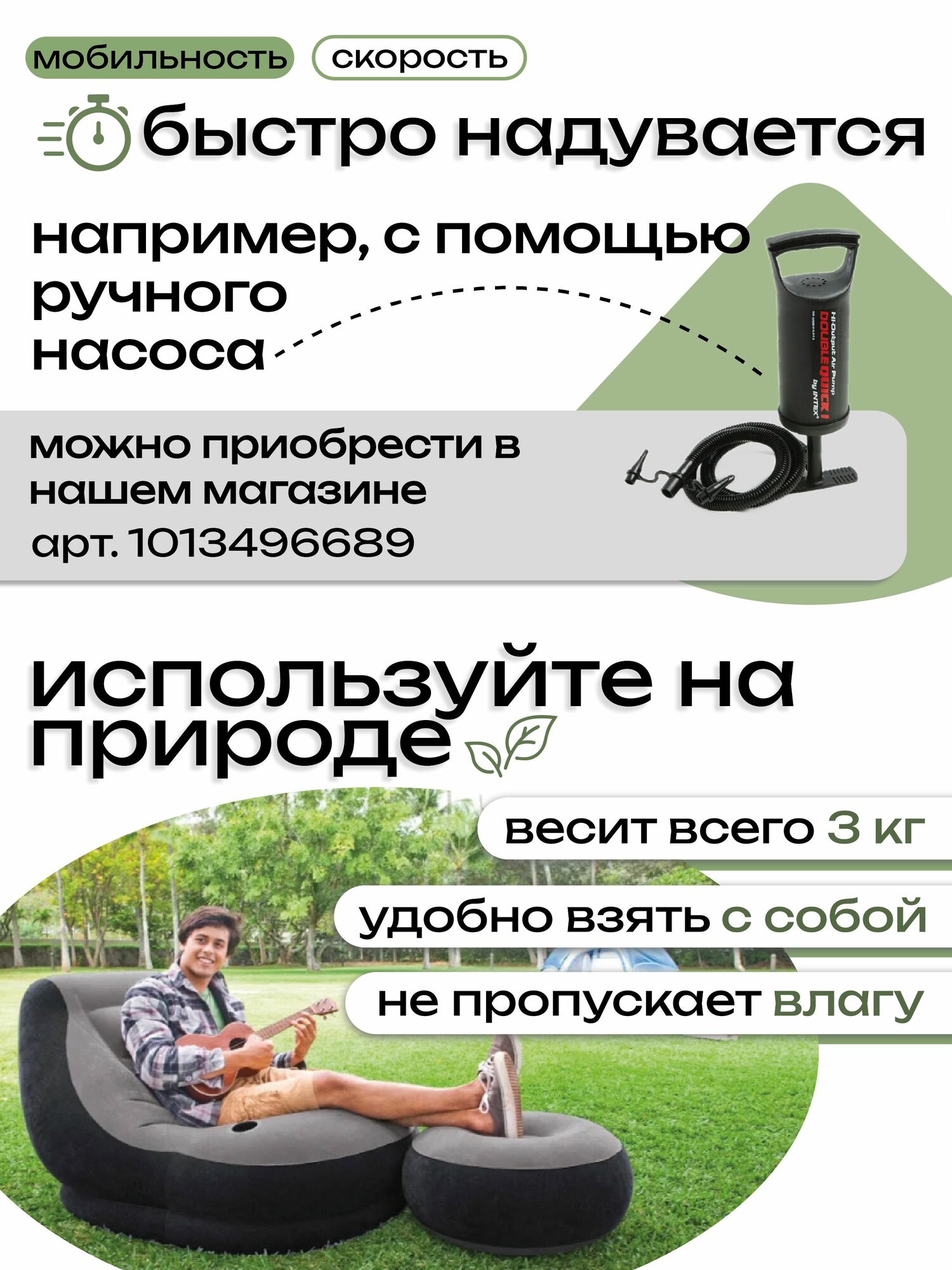 Надувное кресло с пуфиком от Intex – по своему уникальное решение в области надувной мебели. Кресло на ощупь ничем не отличается от бархата, имеет встроенный подстаканник и отдельный пуфик для ног. Для изготовления кресла и пуфика использован плотный и износостойкий ПВХ с нанесенным флокированием – это сделало материал очень приятным на ощупь. Продуманная эргономика комплекта разрабатывалась с одной целью – созданию идеального кресла для зоны отдыха. На нем можно с комфортом разместиться, положив ноги на пуфик, или же сидеть как на обычном кресле, не используя пуфик как подставку. Его можно надуть за несколько минут при необходимости, и получить полноценную мебель для отдыха. Продуманные формы вместе в комплексе с приятным на ощупь покрытием помогут расслабиться после тяжелого трудового дня. Кресло можно разместить где угодно, можно как угодно его перемещать и создавать идеальную зону отдыха исходя из своих потребностей. Этот комплект может быть как рабочим креслом, так и установленным в гостиной перед телевизором – все зависит от нужд владельца. Характеристики товара размер кресла - 99х130х76 см, пуфика – 64*28 см. Максимальная нагрузка – 100кг. Материал сверху – серый винил 0,52 мм. Материал по бокам – черный винил 0,52 мм. Материал нижней части – черный винил толщиной 0,38 мм. Вес – 3,57 кг. 1 подстаканник Клапан 2-в-1 Артикул – 68564. Штрих код – 078257685646. Комплектация товара Насос приобретается отдельно. Характеристики и комплектация могут быть изменены производителем без предварительного уведомления.