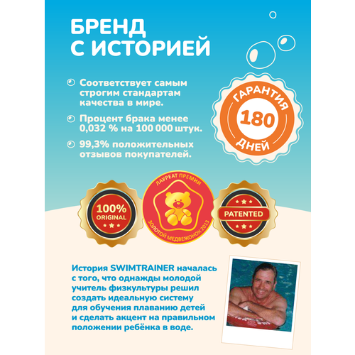Круги SWIMTRAINER – это 3-этапная система безопасного и весёлого обучения плаванию, цель которой привить любовь к большой воде на всю оставшуюся жизнь. На каждом этапе обучения ребёнок постепенно знакомится с глубокой водой, поэтапно осваивая базовые движения рук, ног и их координацию. При этом от этапа к этапу поддержка становится всё меньше так, чтобы по окончании обучения ребёнок мог правильно плыть самостоятельно, без какой-либо внешней поддержки. Для каждого этапа предназначен свой круг SWIMTRAINER. Отличить их легко по цвету. Красный круг – для первого этапа, оранжевый – для второго и жёлтый – для 3-го этапа. К каждому кругу прилагается инструкция с описанием упражнений. Выбирайте подходящий этап для вашего ребёнка по его навыкам, опыту в воде и возрасту. Оранжевый SWIMTRAINER «Сlassic» – это второй этап обучения детей плаванию. Задача на этом этапе – научиться правильно выполнять гребки руками (брасс), а затем научиться координировать их с отталкиваниями ног. Цветные камеры оранжевого круга меньше, чем у красного (1-й этап), но больше, чем у жёлтого (3-й этап). Таким образом, ребёнок приближается к воде, и у него появляется больше свободы движений. Оранжевый SWIMTRAINER «Сlassic» предназначен для детей уже знакомых с глубокой водой или уже физически достаточно активных. В идеале (но не обязательно) они уже должны освоить отталкивания ножками на первом этапе. * 5 независимых надувных камер * Запатентованная система фиксации * Малыш не выскользнет и не перевернётся * Быстро и легко надевается и снимается * Обеспечивает правильное «лежачее» положение в воде В комплекте: В комплекте: * Надувной круг SWIMTRAINER «Classic» * Инструкция на русском языке с описанием упражнений Характеристики: Характеристики: * Для детей от 2 до 6 лет * Уровень: продвинутый * Вес ребёнка: 15-30 кг * Материал: 100% ПВХ * Вес в упаковке: 0,38 кг * Диаметр в надутом виде: 39 см * Размер в обхвате талии: 54-55 см * Гарантия: целых 6 месяцев со дня покупки