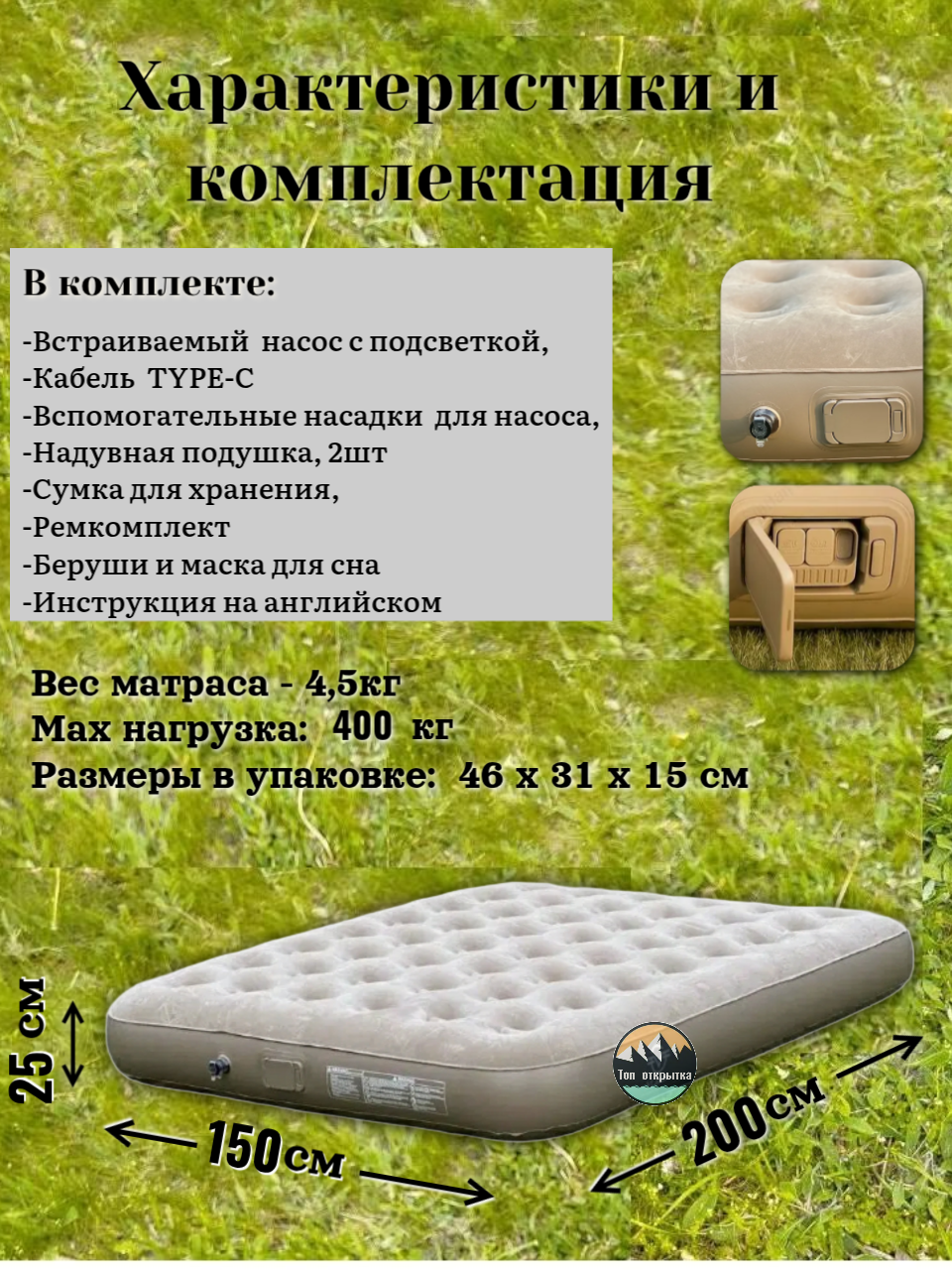 Надувной матрас со встроенным насосом: комфорт и удобство для вашего отдыха Надувной матрас изготовлен из высококачественного материала ПВХ, который обеспечивает долговечность и устойчивость к механическим повреждениям. Флокированное покрытие предотвращает скольжение постельного белья и легко чистится. Встроенный насос позволяет быстро надувать и сдувать матрас, а также регулировать его упругость. В случае отсутствия зарядки у насоса, можно использовать механический насос. Насос заряжается через USB-порт при помощи кабеля TYPE-C. Матрас легко переносить и хранить, он занимает мало места в сложенном состоянии. Размеры матраса составляют 200 х 150 х 25 см. В комплект входят: встраиваемый насос с подсветкой, кабель TYPE-C, вспомогательные насадки для насоса, надувная подушка (2 шт.), сумка для хранения, рем комплект, беруши и маска для сна. Вес матраса составляет 4,5 кг, а размер упаковки – 46 х 31 х 15 см. Выбирая надувной матрас со встроенным насосом, вы получаете комфортное и удобное решение для отдыха и сна, которое прослужит вам долгое время и обеспечит качественный отдых.