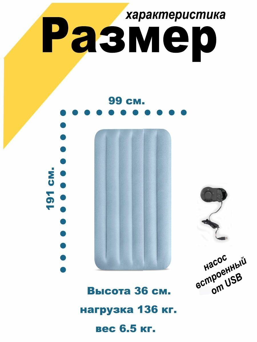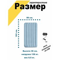 Погрузитесь в комфорт с нашим надувным матрасом! Ищете идеальное решение для отдыха на природе или комфортного сна в домашних условиях? Мы представляем вам надувной матрас размером 99х191х36 см, который сочетает в себе удобство, надежность и стиль! Преимущества нашего матраса: Встроенный насос USB 5V: Забудьте о ручных насосах и сложных манипуляциях! Всего за несколько минут ваш матрас будет готов к использованию. Идеально подходит для путешествий или кемпинга! Большая грузоподъемность: С нагрузкой до 136 кг наш матрас уверенно выдержит даже самых крупных пользователей, обеспечивая при этом максимальный комфорт и поддержку. Эргономичный дизайн: Высота в 36 см обеспечивает отличный уровень комфорта и поддерживает правильное положение тела во время сна. Вы забудете о том, что вы спите на матрасе! Легкость и удобство транспортировки: Матрас легко надувается и сдувается, а благодаря компактным размерам его удобно хранить и переносить. Качество материалов: Мы используем только высококачественные, устойчивые к повреждениям и водонепроницаемые материалы, что гарантирует долговечность и надежность. Зачем ждать? Сделайте шаг навстречу комфортному сну и незабываемым моментам отдыха! У нас есть всё, чтобы сделать ваше времяпрепровождение приятным и беззаботным. Внимание! Если Вы приобрели надувное изделие в зимнее время года, то НИ В коем случае не доставайте его сразу из коробки. Поставьте в теплое место, желательно возле батареи на 2 – 3 часа. Только после этого извлеките товар из коробки. Убедитесь, что материал стал мягким и накачайте на 80 %. Изделие примет форму, складки разгладятся, через час можно накачать полностью.