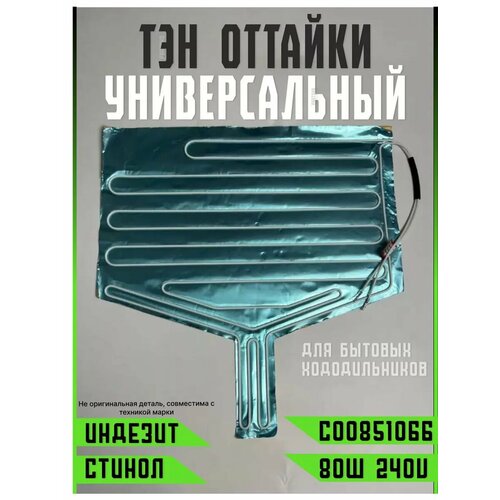 Тепловой электрический нагреватель (ТЭН) поддона каплепадения холодильников Индезит (Indesit), Hotpoint-Ariston (Хотпоинт-Аристон), Стинол (Stinol). Тепловой электрический нагреватель (тэн оттайки) имеет коды взаимозамен: 851066/C00851066. Используется для подогрева поддона испарителя при выводе талой воды из системы No Frost. Номинальное напряжение: 240В. Страна-производитель: Италия. Используется для подогрева поддона испарителя при выводе талой воды No FrostПитание: 220-240 V. Мощность: 70W - 83,3W. Число контактов: 2 контакта. Материал корпуса: пластик, резина, фольга. Холодильное оборудование: оттайка, разморозка, слив конденсата