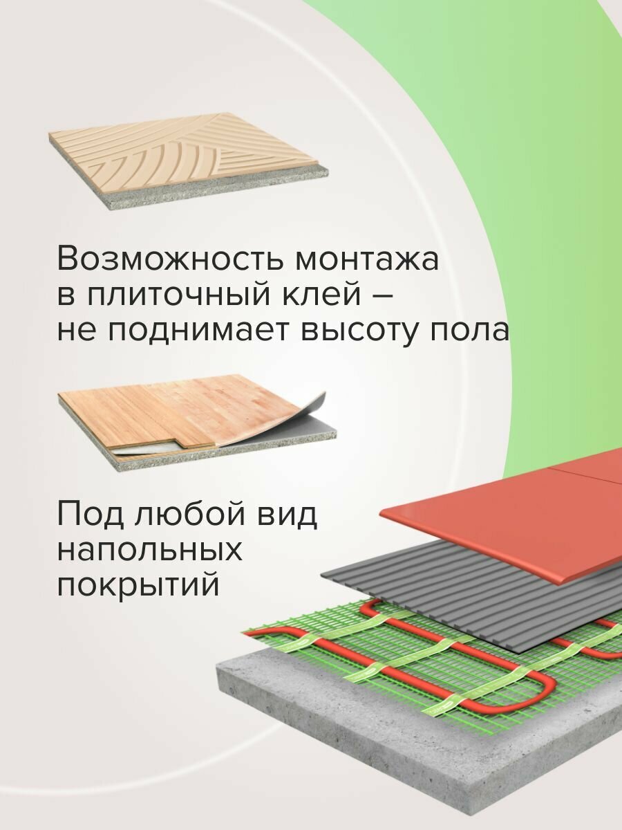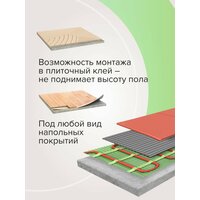 Предназначен для монтажа в тонкую стяжку, плиточный клей или наливной пол. Обеспечивает подогрев поверхности пола для создания дополнительного комфорта в помещении. Может монтироваться как в стандартных, так и холодных помещениях. Удобная, с постоянным шагом раскладка кабеля на сетке позволяет осуществить легкий и быстрый монтаж термомата на любых поверхностях даже сложных конфигураций.