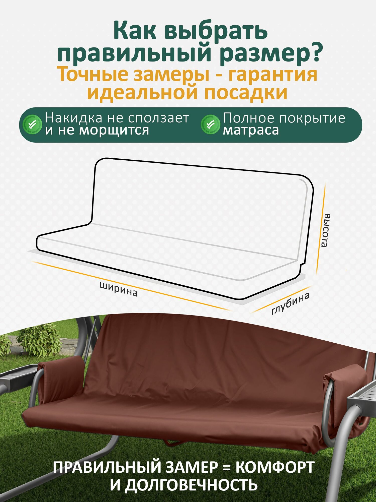 Водонепроницаемая накидка на матрас для садовых качелей – поможет защитить поверхность матраса от попадания пыли и грязи, от влаги и прямых солнечных лучей. Данная накидка изготовлена из водонепроницаемой и прочной ткани, устойчивой к износу и температуре. Благодаря ей, матрас всегда будет оставаться чистым и сухим, что поможет продлить срок его службы на очень долгое время.