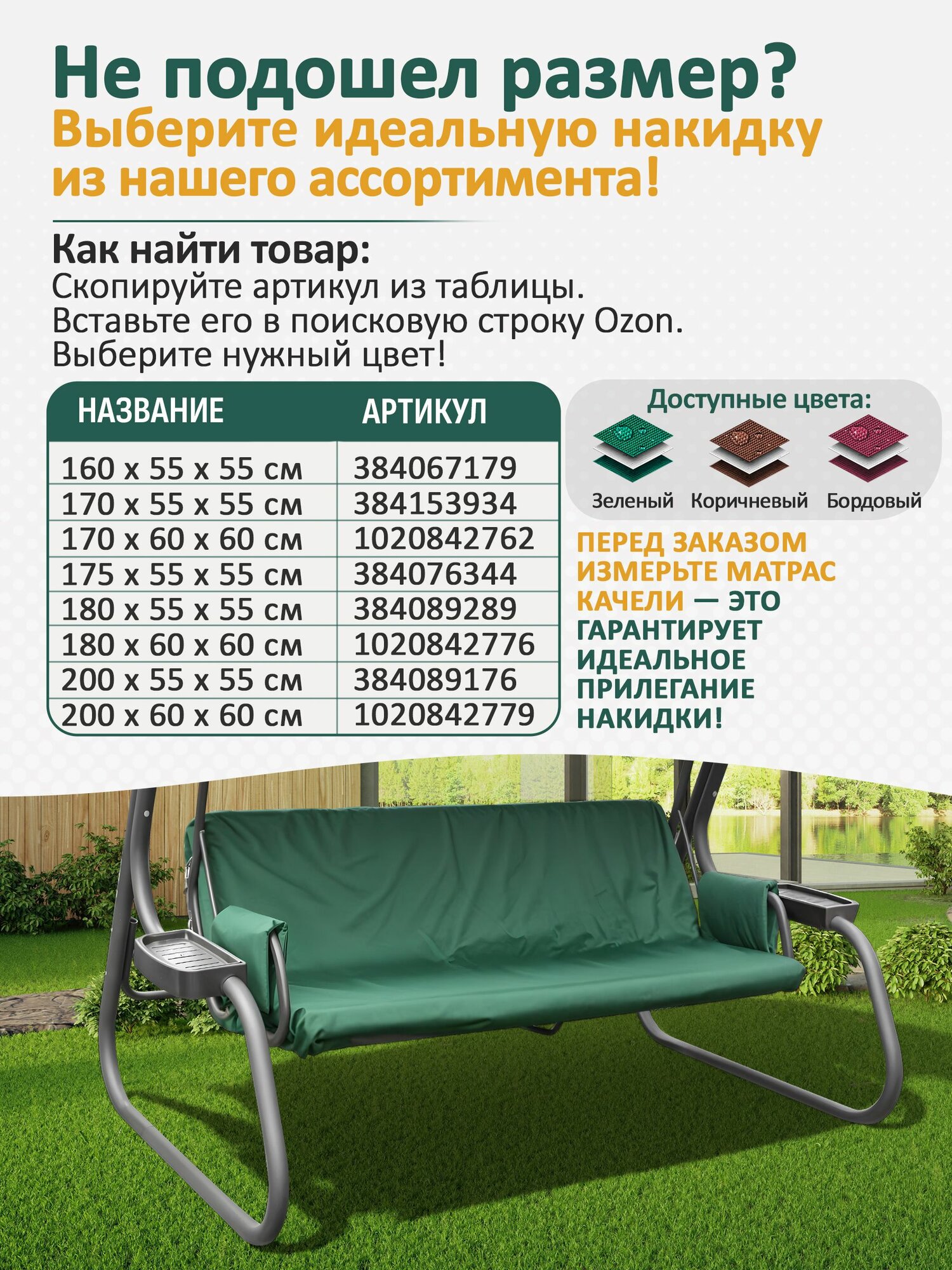 Водонепроницаемая накидка на матрас для садовых качелей – поможет защитить поверхность матраса от попадания пыли и грязи, от влаги и прямых солнечных лучей. Данная накидка изготовлена из водонепроницаемой и прочной ткани, устойчивой к износу и температуре. Благодаря ей, матрас всегда будет оставаться чистым и сухим, что поможет продлить срок его службы на очень долгое время.