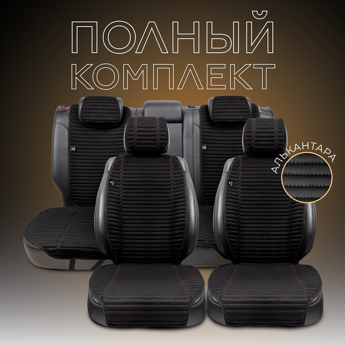 Купить Чехлы в машину на сиденья универсальные в полный салон . Модель L POLOSA PK. Черный/бежевая строчка с доставкой по всей России.