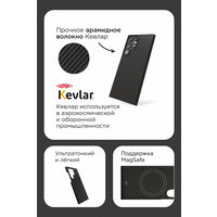 Стильный чехол выполнен из арамидного волокна – кевлара, который известен своей невероятной прочностью. Данный материал используется в пуленепробиваемой броне, а также аэрокосмической промышленности. Лёгкий и тонкий аксессуар точно повторяет контуры Samsung и плотно прилегает к нему, защищая от попадания пыли. Уникальный бесшовный стиль – чехол приятен на ощупь, не скользит, его комфортно держать в руке. В дизайне использованы специальные вырезы под боковые кнопки для удобства управления Samsung. Небольшая рамка вокруг блока камер и над бортиками дисплея оберегает устройство от царапин. Чехол поддерживает технологию MagSafe.