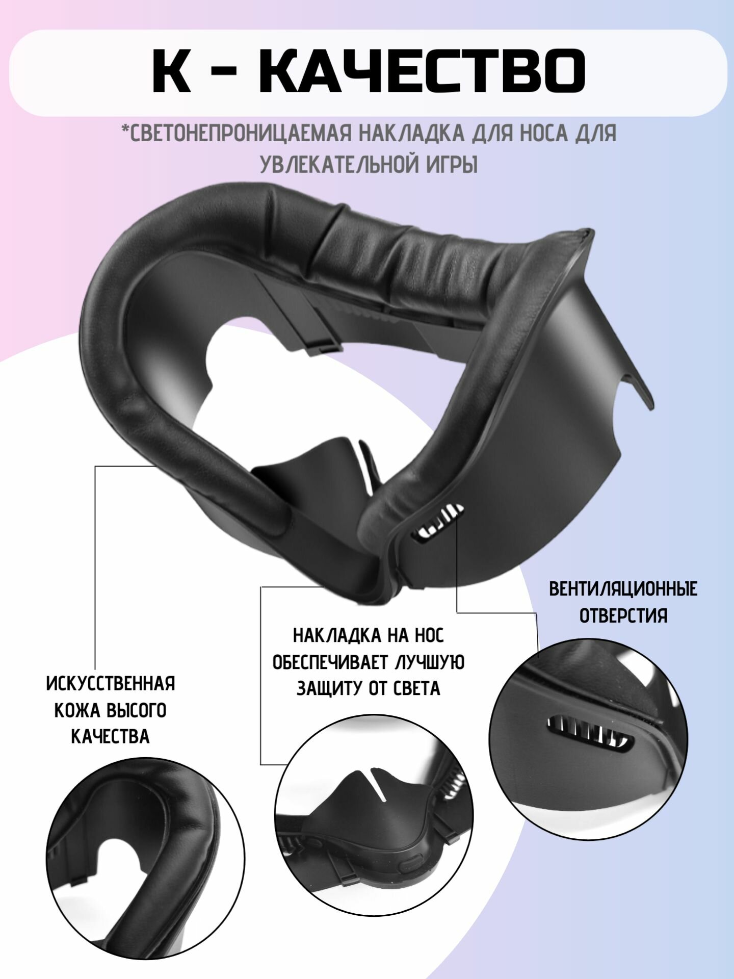 Накладка-маска с пластиковой основой и мягкой амортизацией для очков виртуальной реальности идеально подходит к модели Oculus Quest 3, обеспечивая комфортную и точную посадку благодаря своей геометрии. Материал из эко-кожи приятен на ощупь и предотвращает проникновение внешнего света внутрь маски, создавая идеальные условия для погружения в виртуальную реальность. Эргономичная конструкция защищает лицо и очки от излишнего пота и влаги, которые могут появиться во время активных игр.