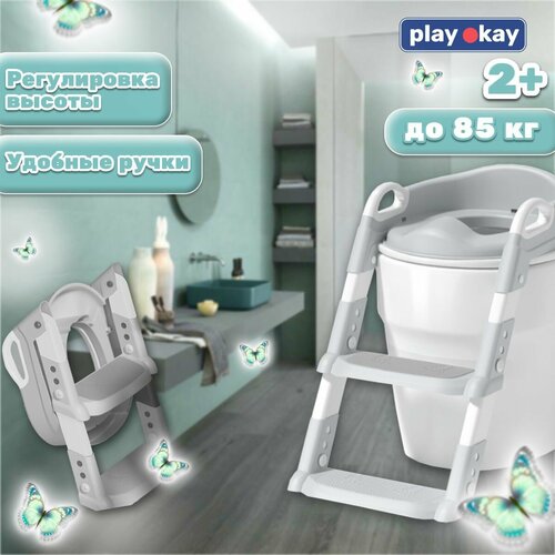 Купить Накладка на унитаз детская с лесенкой Play Okay сиденье c подставкой, стульчак ободок со ступенькой, мягкий и анатомический, универсальный и комфортный из безвредного материала, цвет серый с доставкой по всей России.