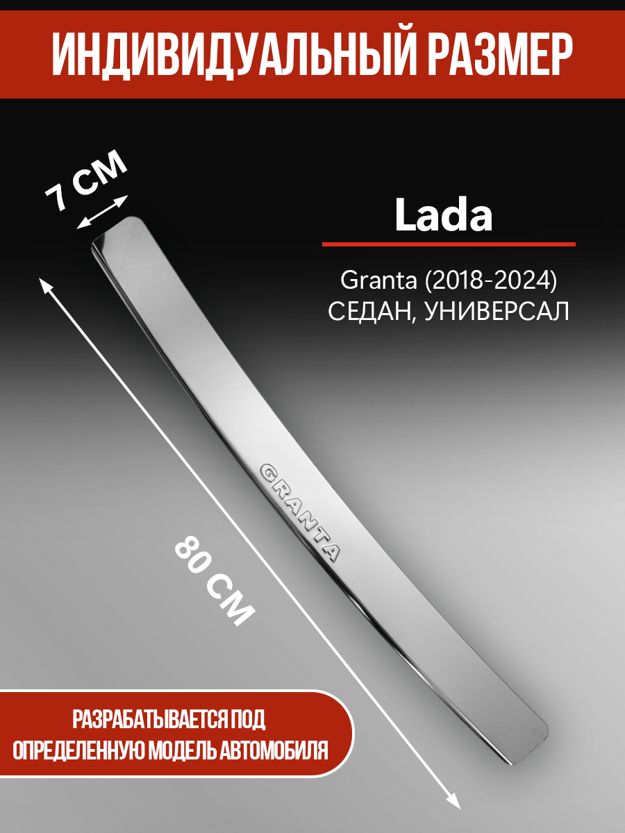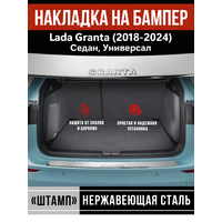 Материал накладки устойчив к воздействию химических веществ, в том числе, различных растворителей. Надпись «Granta» осуществляется методом прямого выдавливания - штампом (надпись имеет объемную фактуру). Накладка на бампер полностью повторяет геометрию автомобиля Лада (ВАЗ) Гранта седан, универсал (2018, 2019, 2020, 2021, 2022, 2023 и 2024 года).