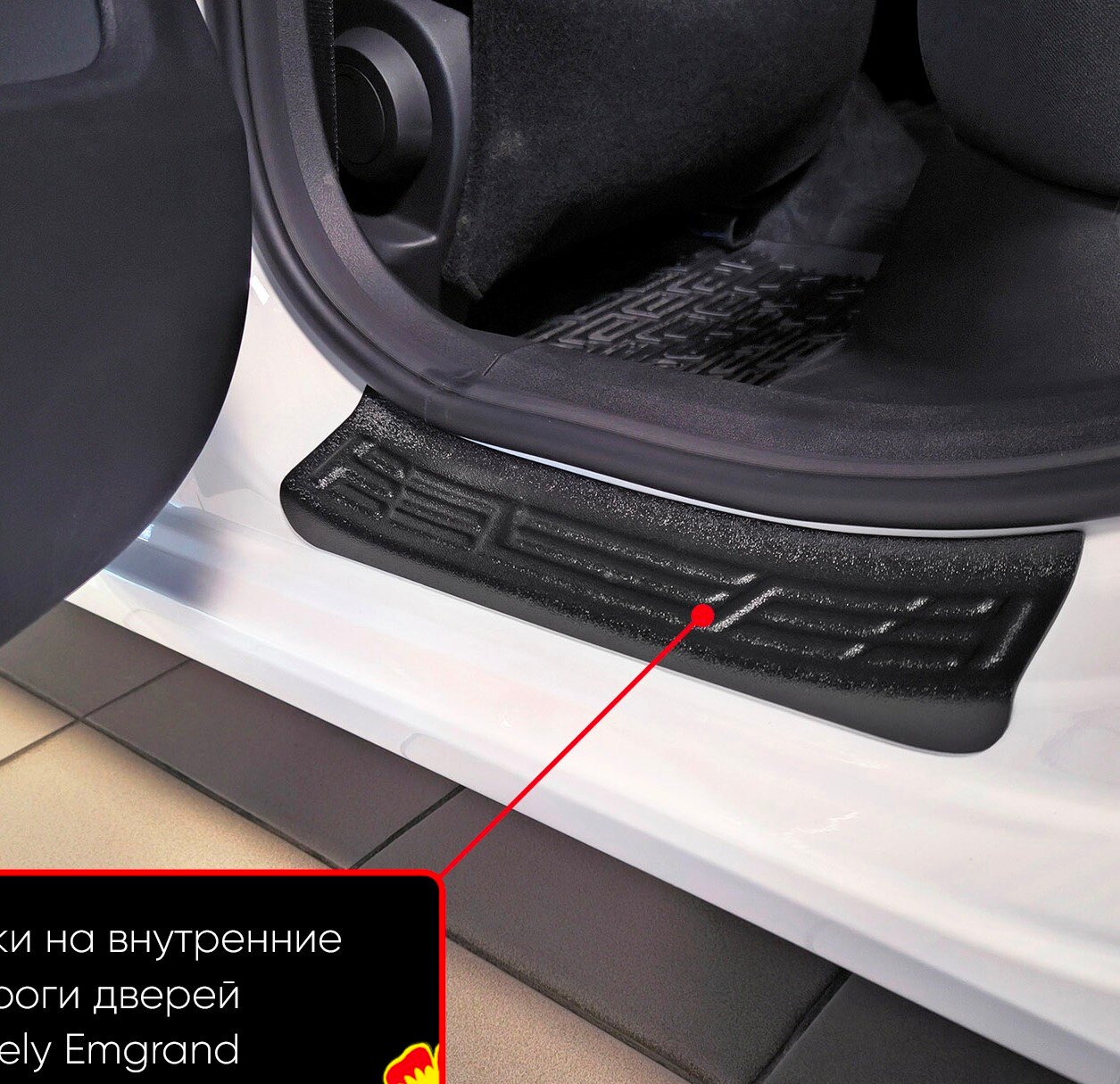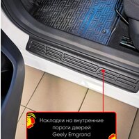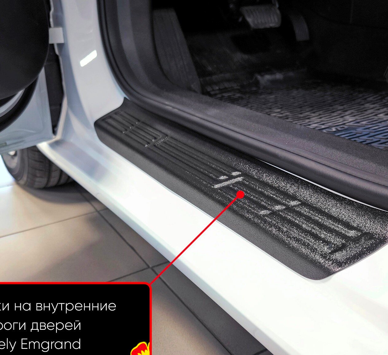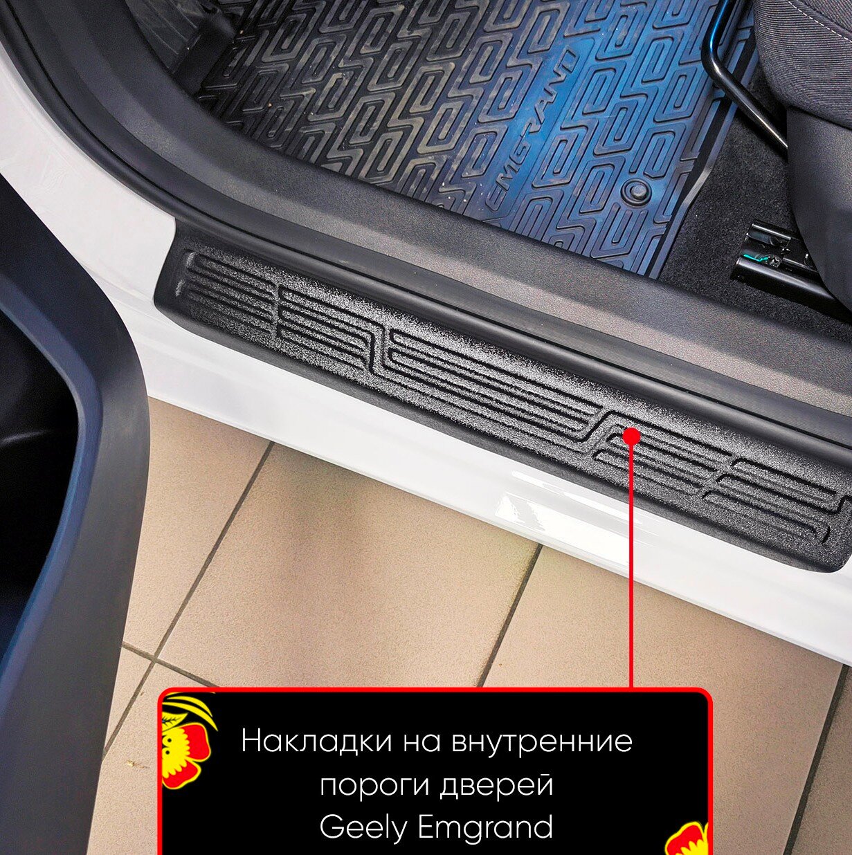 Накладки на внутренние части порогов дверей для Geely Emgrand 2021- представляют из себя детали из АБС-пластика с тисненой поверхностью. Пластик АБС, очень прочный и из года в год подтверждает свою стойкость к самым сложным внешним воздействиям.