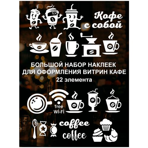 Большой набор разных наклеек для оформления витрины вашей кофейни - это прекрасный способ добавить яркие и заметные элементы в интерьер, которые подчеркнут тематику вашего заведения. В этом наборе вы найдете наклейки с изображением кофе, wi-fi, кофейной кружки, кофемолки, чашки и кофейного стаканчика.