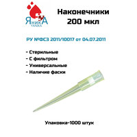 Наконечник для дозаторов универсальный тип Eppendorf, стерильный с фильтром в упаковке 1000 штук (без ДНКаз, РНКаз) 200 мкл, «Yancheng Huida Medical Instruments Co, Ltd.» China, желтые. Срок годности: 5 лет с момента производства. Наконечники апирогенные, сертифицированные на отсутствие ДНКаз, РНКаз и эндотоксинов. Совместимы с дозаторами большинства марок: Ленпипет, Eppendorf, Hamilton Gilson, Biohit, Finnpipette, Nichiryo, Jencons, Kartell, Genex, HTL, Brand. Технические характеристики: - Объём - 200 мкл; длина наконечников – 50,46 мм; - Цвет – Желтый; - Материал – полипропилен; - Стерильность – да; - Упаковка - 1000 шт; - Страна производитель – Китай; - Наконечники стерильны; - Наличие фильтра. РУ № ФСЗ 2011/10017 от 04.07.2011 г.