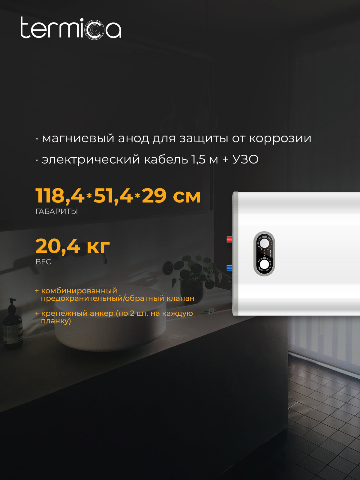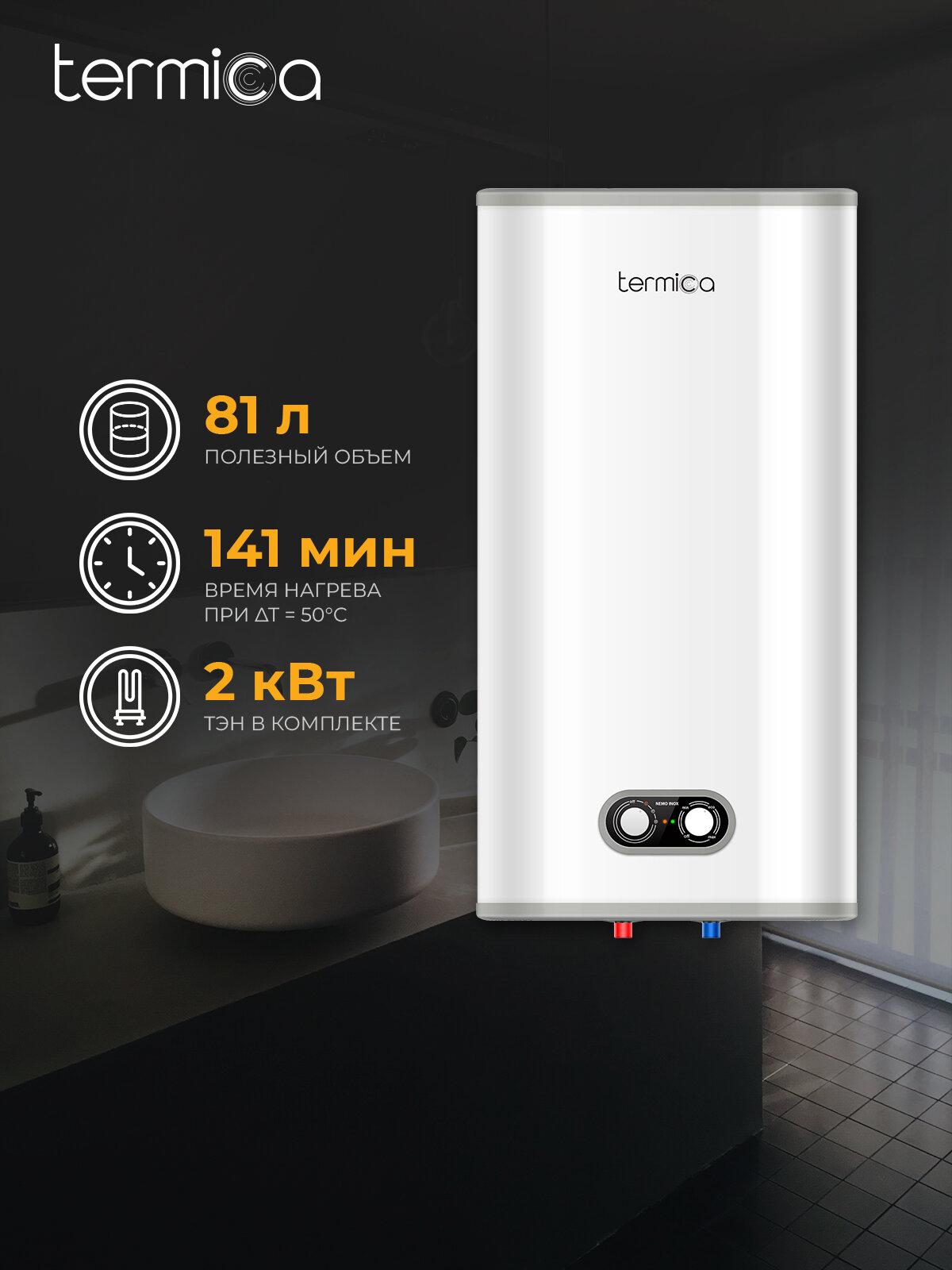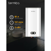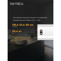 Электрический накопительный водонагреватель на 100 литров TERMICA NEMO 100 INOX изготовлен в соответствии с современными технологиями и действующими нормативными актами. Внутренний бак бойлера с полезным объемом 81 литров выполнен из высококачественной нержавеющей стали AISI 304, обеспечивающей защиту от коррозии и долговременную комфортную эксплуатацию. Накопительный водонагреватель предназначен для длительного хранения подготовленной горячей воды, а также для снижения потребления энергии источником нагрева, ёмкость водонагревателя снабжена слоем теплоизоляции из пенополиуретана. -Размеры электрического накопительного бойлера: В118,4 Х Ш51,4 Х Г29 см -Вход холодной воды 1/2HP -Выход горячей воды 1/2HP Комплектация: - Водонагреватель с электрическим кабелем 1,5м и УЗО - Предохранительный клапан - Крепежный анкер (по 2шт на каждую крепёжную планку) - Руководство по эксплуатации