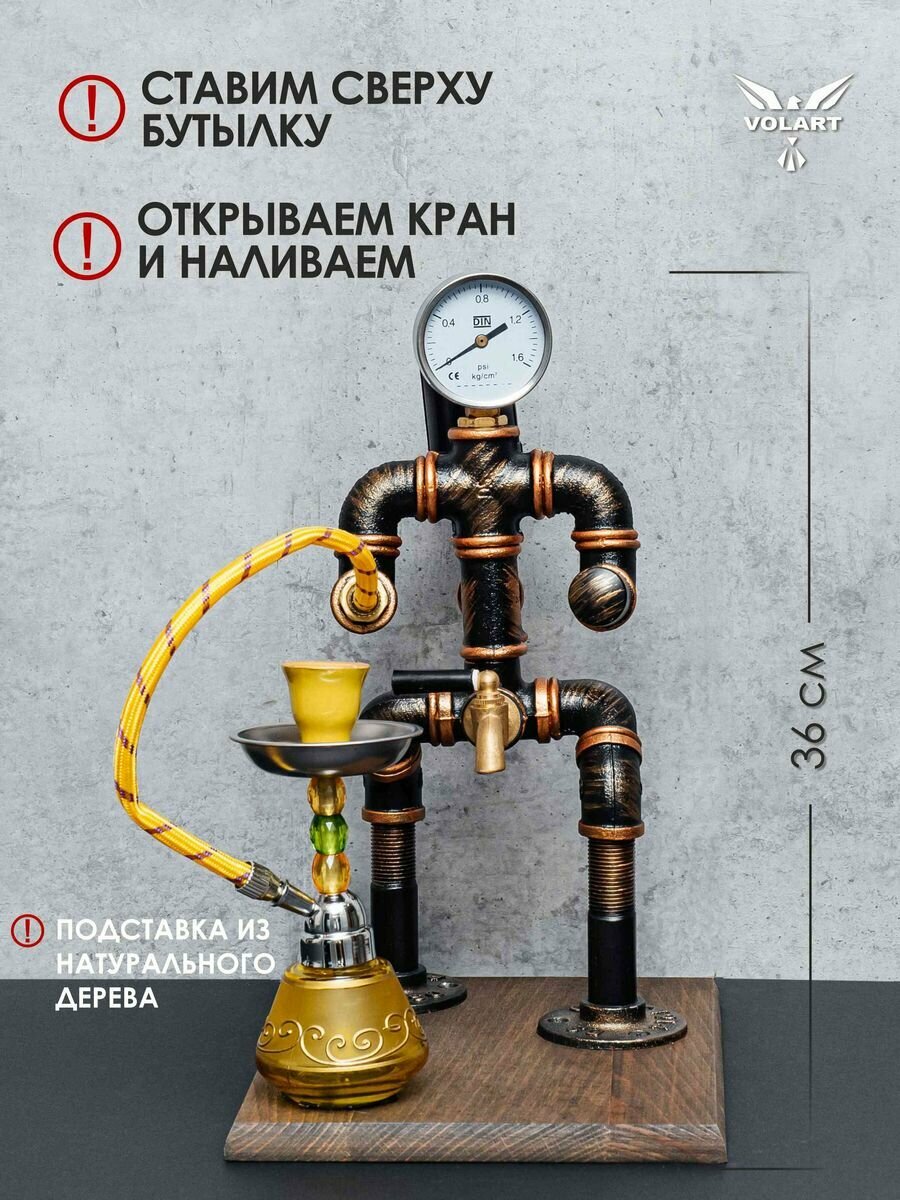 Наливатор алкоголя - это оригинальный подарок, который никого не оставит равнодушным: он станет обязательным участником любого застолья, вызывая восхищение гостей. Помимо того, что такой держатель для бутылки очень функциональный - это отличный сувенир, который прекрасно впишется в интерьер. Как работает данный диспенсер для напитков: открытая бутылка вставляется в цилиндрическое отверстие, расположенное за спиной "Кальянщика" (это необходимо сделать таким образом, чтобы не пролить содержимое бутылки - надеть приспособление сверху на горлышко бутылки, затем перевернуть, чтобы бутылка оказалась дном кверху). При открывании крана, жидкость будет выходить из него благодаря силе тяжести. Использование наливатора алкоголя безопасно - внутри жидкость проходит по пищевой трубке. Диспенсер для алкоголя совместим практически со всеми видами бутылок (за исключением бутылок с клапаном - в этом случае предварительно необходимо его снять). Явные плюсы использования диспенсера для алкогольных напитков - это простота и эффектность пополнения запаса напитка, а также экономия места. Держатель для бутылок имеет высоту 34 см. Кран выполнен из чугуна, подложка из натурального дерева. Наливатор может пригодиться для вечеринки или в качестве подарка. Подставка для бутылок диспенсер - оригинальный подарок для мужчины любителя кальяна или подарок на новоселье, который точно удивит!