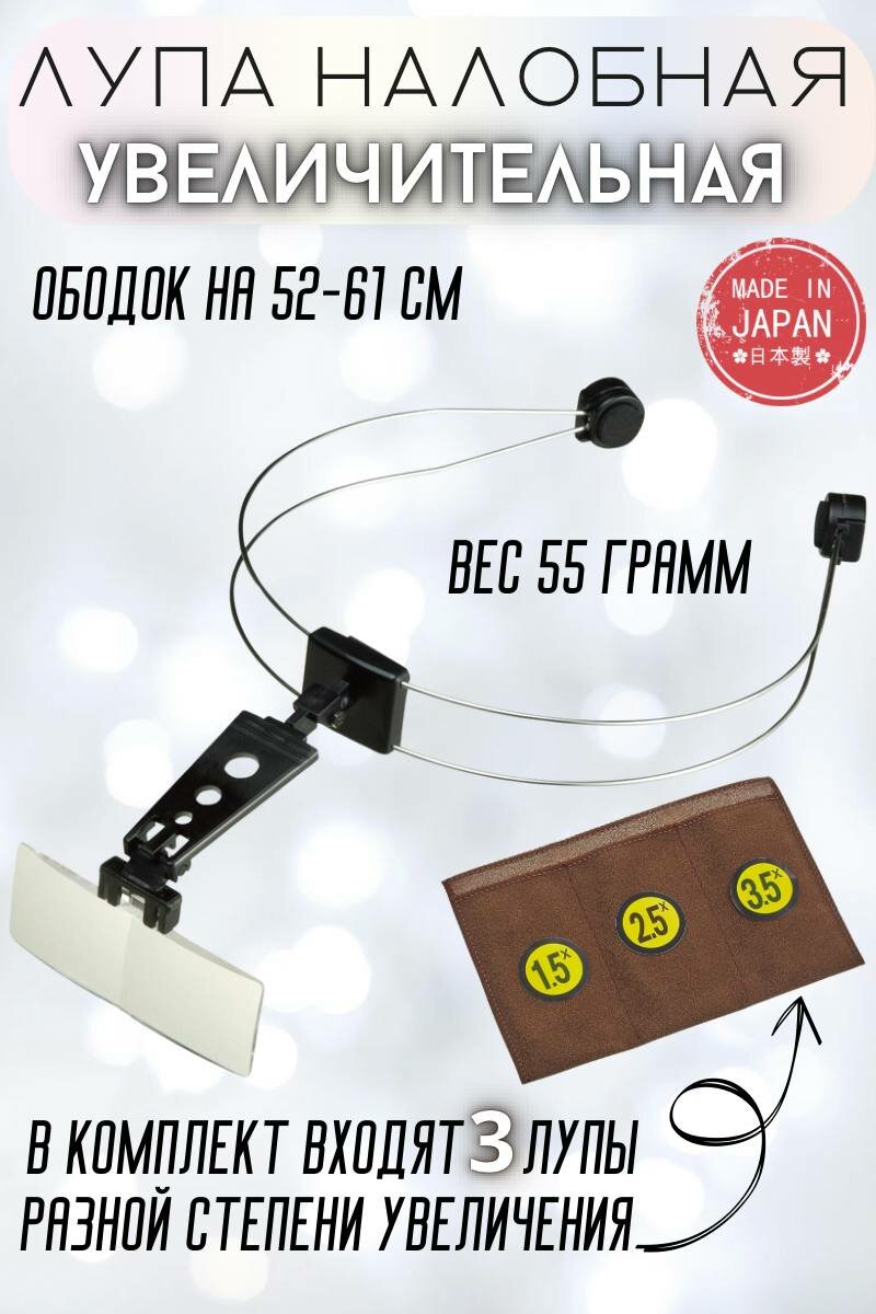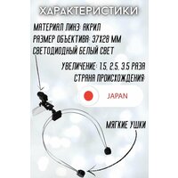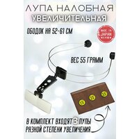 Подходит на объем головы 52-61 см, в комплекте Оправа-ободок-1шт, Линзы-3 шт с увеоичением 1.5, 2.5, 3.5, батарейка - 1 шт