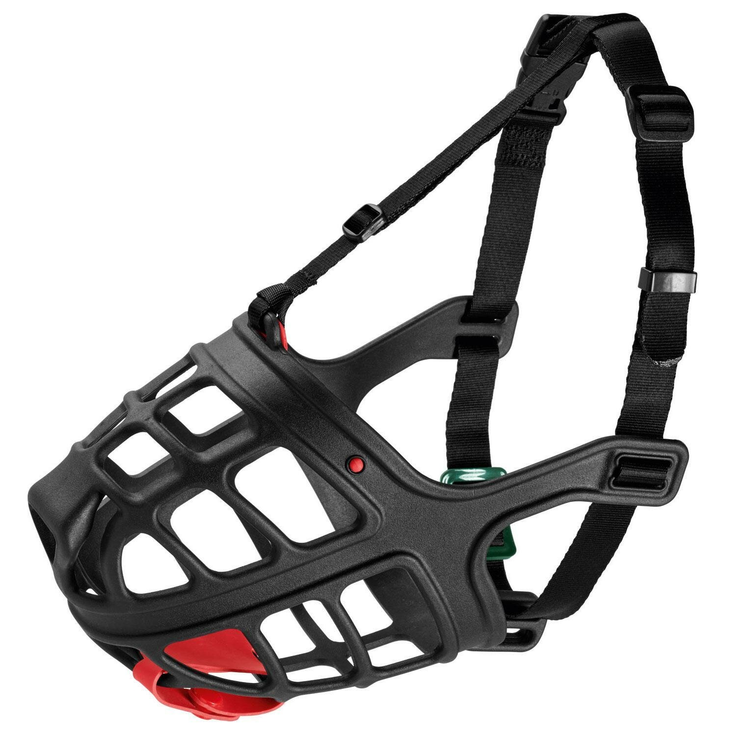 Плавно регулируемые нейлоновые ремни проходят по центру головы, а также за ушами и гарантируют надежную и прочную посадку намордника в любой ситуации.