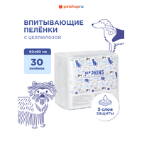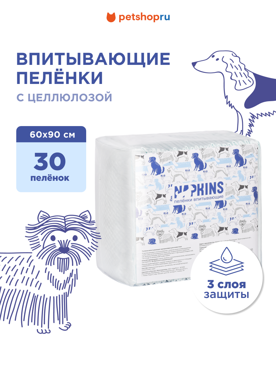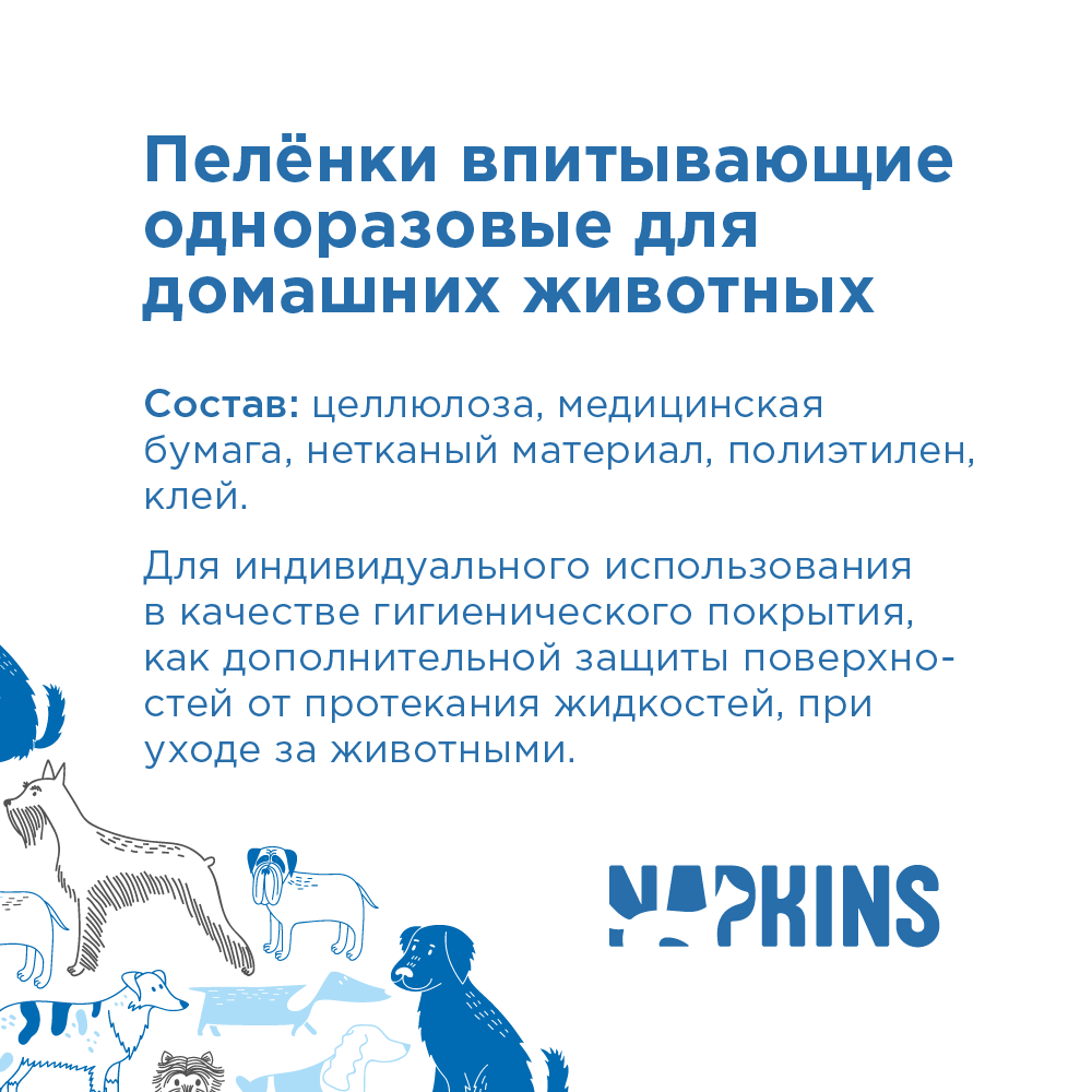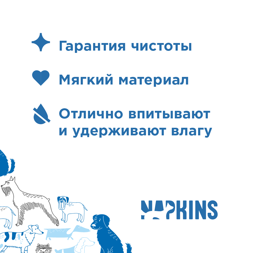 Сохраняя гигиену в ареале обитания животного, пеленки Napkins прекрасно впитывают и удерживают влагу, препятствуя распространению запаха и загрязнений.